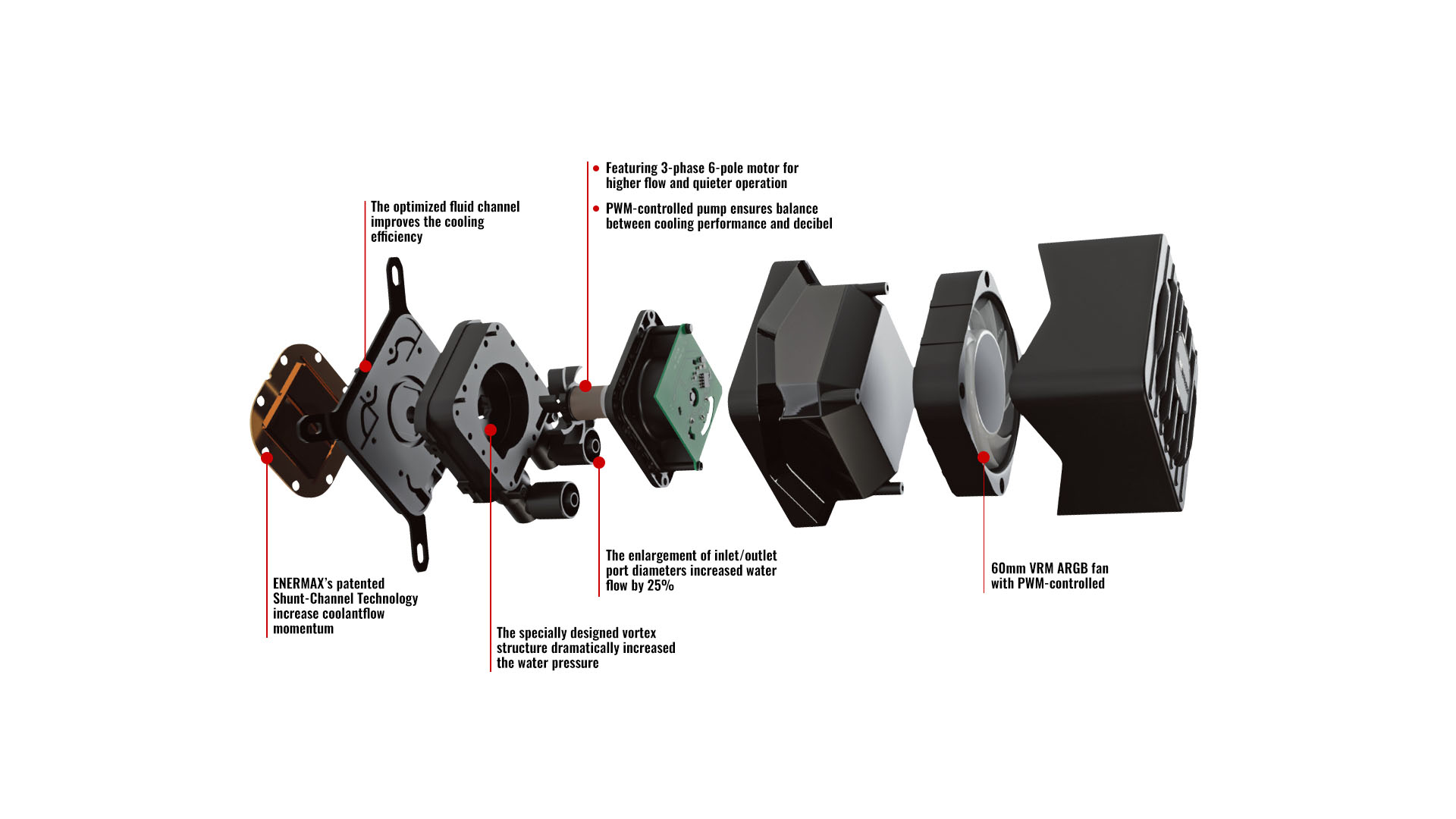 Im Inneren des Pumpengehäuses kommt eine neue Xtreme PWM-Pumpe zum Einsatz. Bei einem Drehzahlbereich von 1200 bis 3000 U/min soll die Pumpe genug Leistung und zugleich einen flüsterleisen Betrieb ermöglichen. Durch den vergrößerten Kühlmitteleinlass und das optimierte Strömungsdesign wird der Gesamtpumpendruck (Hydraulikkopf) um bis zu 30 % und die Kühlmittel-Durchflussrate bis zu 20 % erhöht. So soll genügend Leistung zur Verfügung gestellt werden, um auch sehr leistungshungrige und übertaktete CPUs gut zu kühlen. ENERMAX spricht hier von einer Kühl-Leistung von bis zu 380 Watt (TDP). Die Verbesserung der Kühleffizienz führt so zu einer beeindruckenden 4 °C geringeren Wärmeabgabe pro 100-Watt-Last.