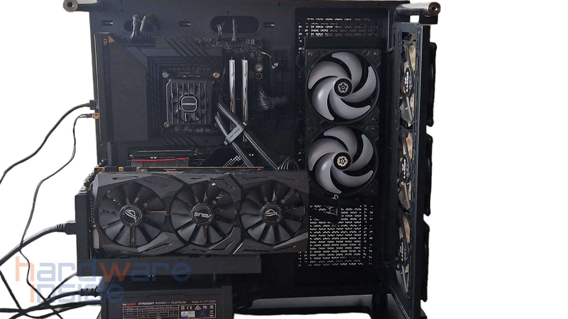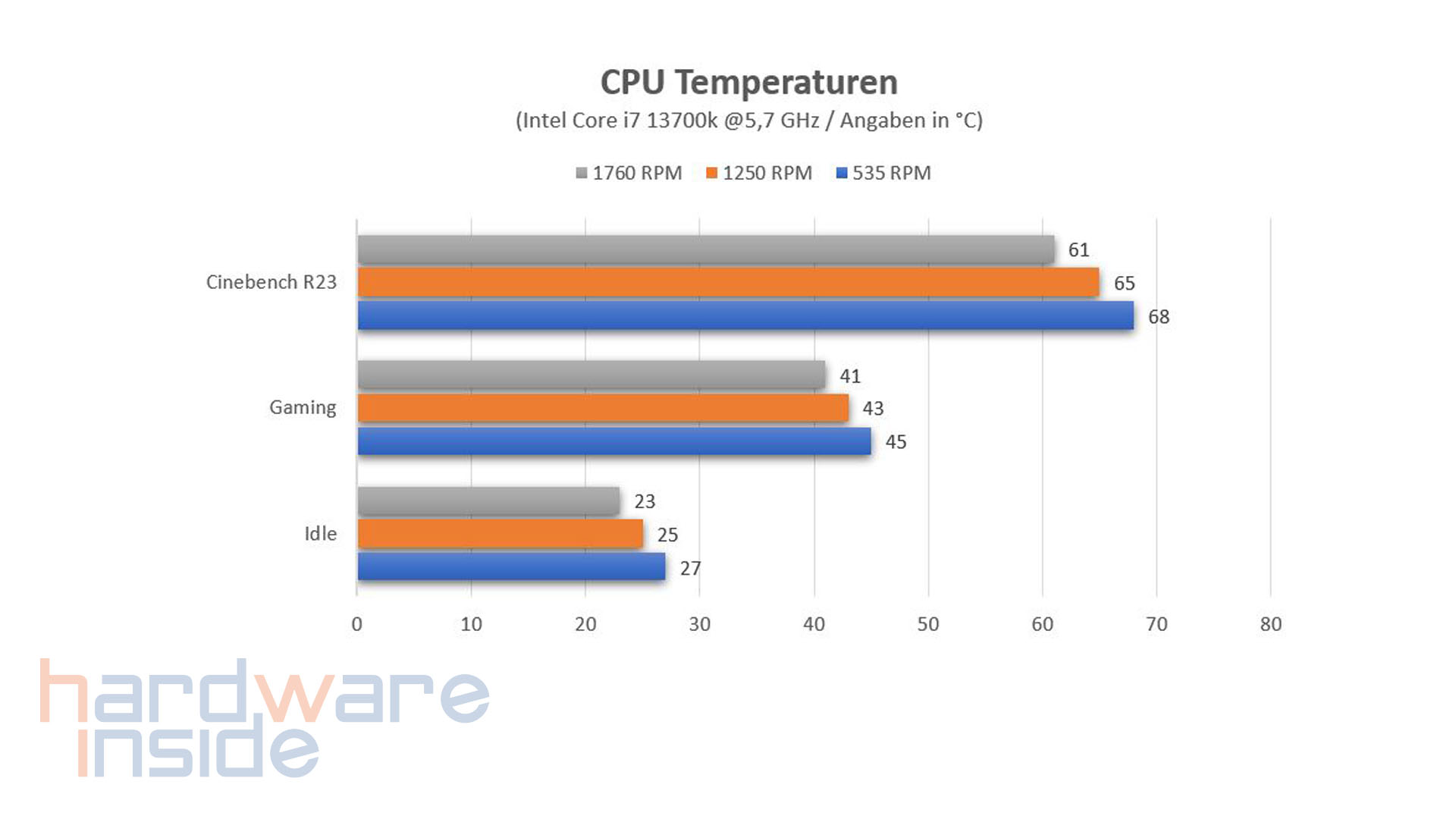 Für unsere Temperaturtests wurden die drei 120 mm Lüfter in der Front konstant auf 35 % gesetzt. Die Temperaturen werden über die Software HardwareInfo ausgelesen. Unsere beiden 120 mm Silent-Flow FDB Lüfter setzten wir via Software auf die minimale, die mittlere und auf die maximale Drehzahl. Dabei untersuchen wir die Temperaturen in drei verschiedenen Szenarien, im Idle, beim Gaming und unter Volllast mit dem Benchmark Cinebench R23 im Loop für jeweils 30 Minuten. Die Pumpe lief während unserer Testphase auf 2700 U/min. Die Lautstärke liegt immer im Auge des Betrachtes und wird von Person zu Person unterschiedlich wahrgenommen. Aus unserer Sicht ist die Lautstärke hier als angenehm leise einzustufen. Selbst unter Volllast konnten wir bei geschlossenem Gehäuse keinen wirklichen Orkan vernehmen. Abgesehen davon sind die erreichten Werte unsererseits Ist-Werte und können natürlich abweichen, je nach verbauter Hardware. Bezüglich der VRMs konnten wir keinen großen Unterschied durch die Regulierung des integrierten 60 mm VRM-RGB-Lüfters während unserer Testphase feststellen. Wir lagen immer im Bereich von 35-51 °C.