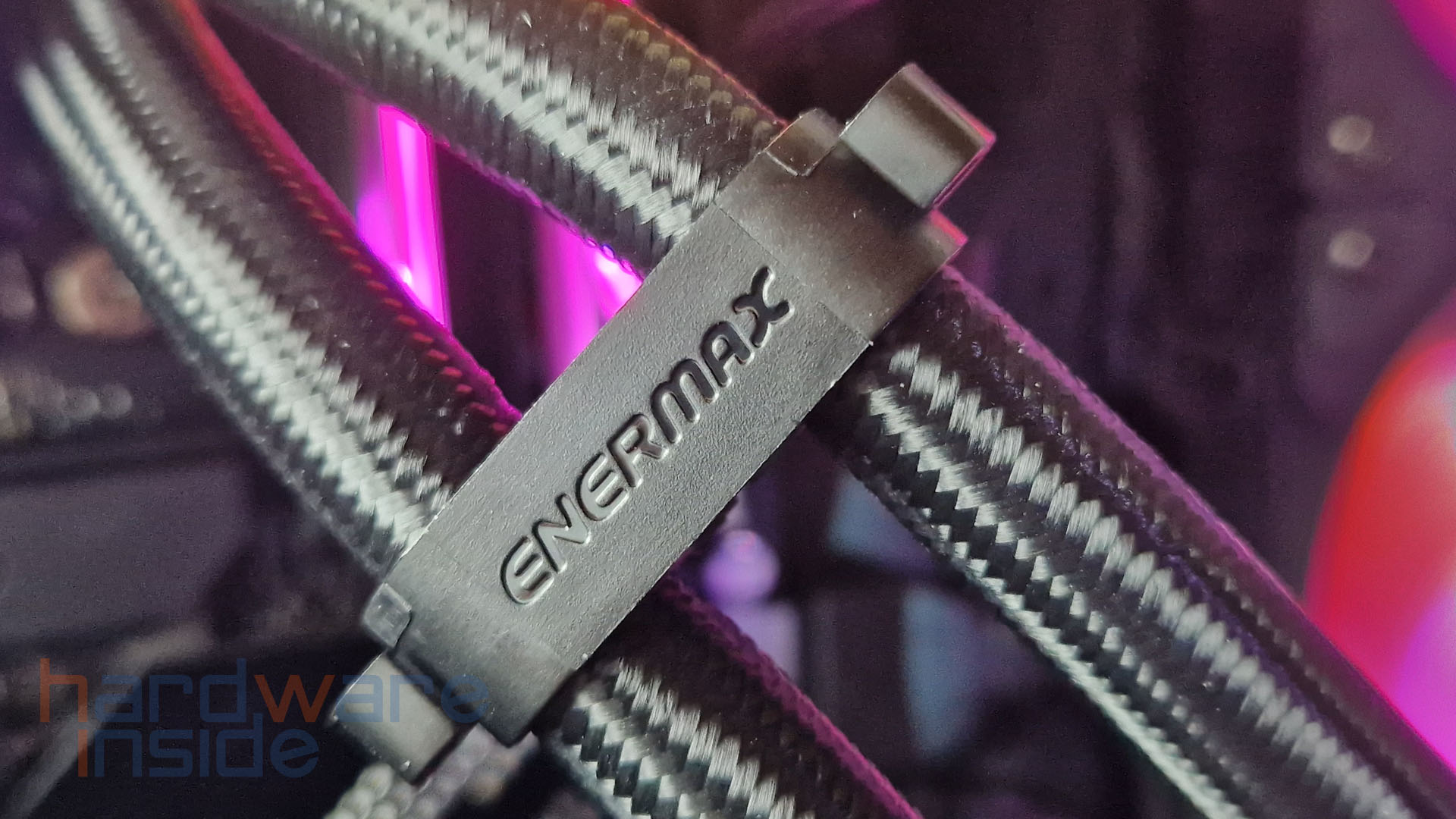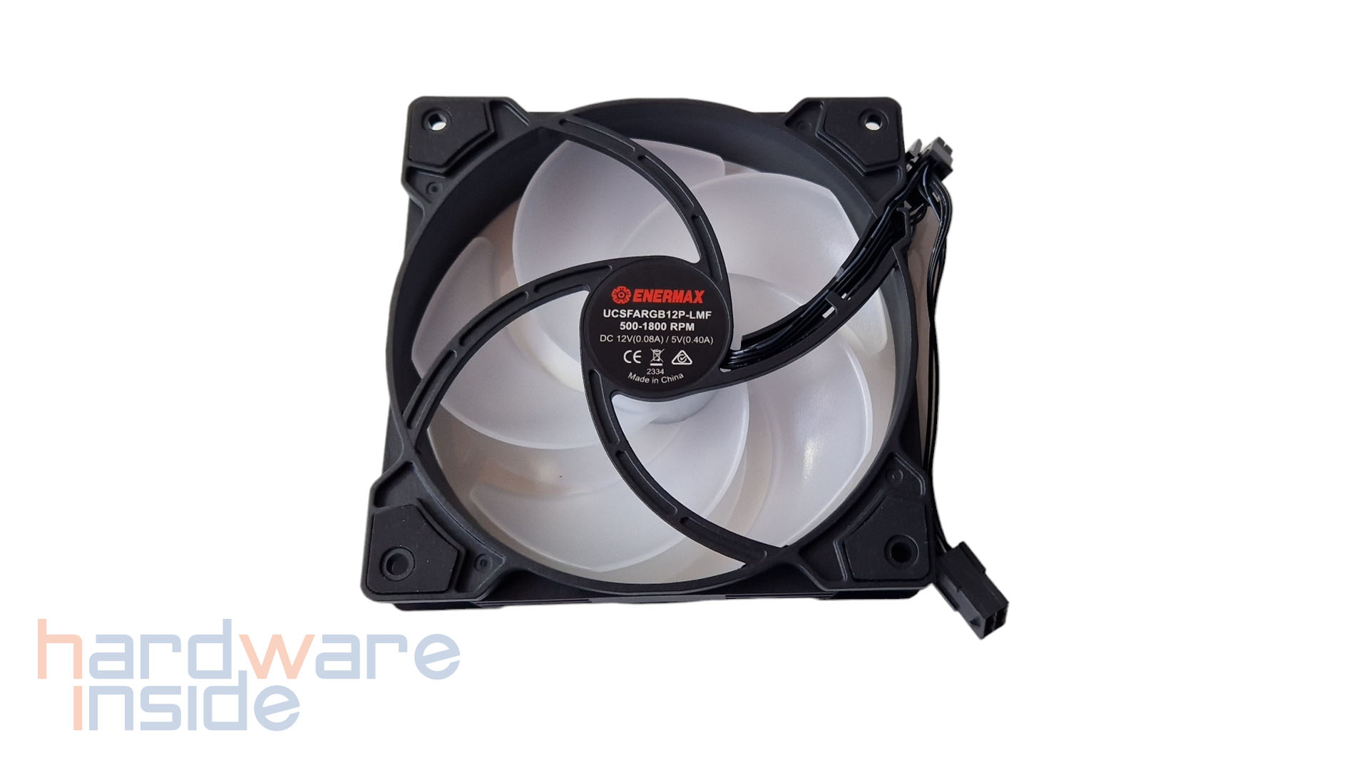 Mit den bereits ab Werk angebrachten Vibrationsdämpfern an allen vier Ecken sollen die im Betrieb entstehenden Vibrationen am Radiator minimiert bzw. verhindert werden. Auf der Lüfternabe ist mittig das ENERMAX-Logo in Form eines Aufklebers platziert.
