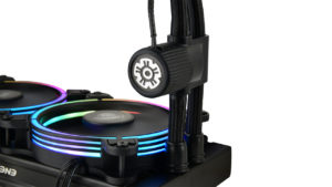 Der RGB-Wasserblock mit adressierbarem LED-Ring und patentierter Durchflussanzeige ermöglicht die Überwachung von Kühlkreislauf und Kühlmittelstand. Um die Lebensdauer des Kühlers zu verlängern, kann das Kühlmittel durch eine Öffnung am Kühlblock nachgefüllt werden.