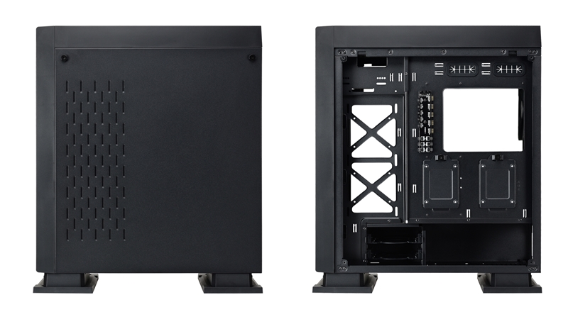Der PSU-Tunnel kann zwei weitere 2.5″/3.5″ HDD/SSD in einem Tray an der Unterseite des Gehäuses unterstützen. Ein externer 5,25″ Einschub kann für ein Gerät mit frontseitiger Ausrichtung wie klassische DVD-Laufwerke oder Geräte mit einem Frontpanel verwendet werden.