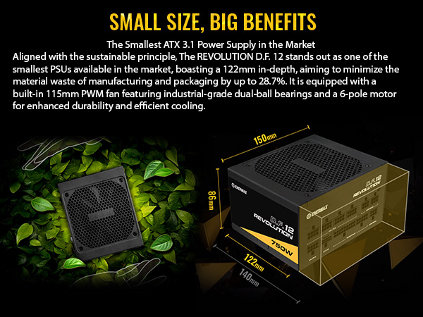 REVOLUTION D.F. 12 reduziert die Kohlenstoffemissionen nicht nur durch die hohe Effizienz in der Stromumwandlung, sondern das Engagement für Nachhaltigkeit zeigt sich auch in der Verpackung des Produkts und im Ersparnis beim Materialeinsatz, um bis zu 28,7% gegenüber herkömmliche ATX Goldnetzteile.