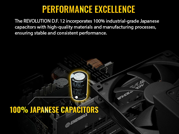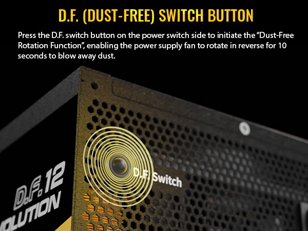 Das REVOLUTION D.F. 12 verfügt über einen 115-mm-Doppelkugellagerlüfter mit der patentierten Dust-Free Rotation (D.F.R.)-Technologie, die eine Selbstreinigungsfunktion und ein Turbo-Schaltknopf bietet, um die Langlebigkeit des Systems durch Minimierung der Staubansammlung im Netzteil zu erhöhen.