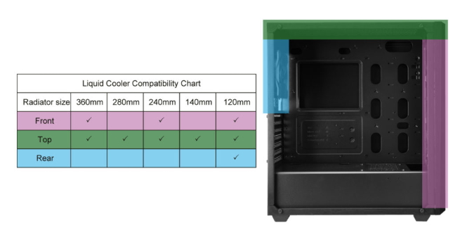 Die flexible Konfiguration des Kühlsystems unterstützt 3x vorgesehene Bereiche für die Installation von Wasserkühlern mit Radiatoren von 360, 280, 240, 140 und 120 mm.