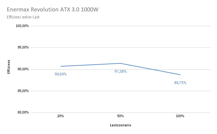 Die Effizienz des Netzteils beträgt bei einer Last von 20%, also 200 W, bereits 90,69%. Im nächsten Lastszenario mit 500 W Last wird sogar ein Wirkungsgrad von 91,38% erreicht. Wird das Netzteil dagegen mit der vollen Nennlast betrieben, liegt der Wirkungsgrad nur noch bei 88,75%. In der Praxis ist dieser Effizienzverlauf normal. Das Enermax Revolution ATX 3.0 1000W verfügt über eine 80Plus Gold Zertifizierung. Diese wurde allerdings mit einer Eingangsspannung von 115 V statt der in Deutschland üblichen 230V durchgeführt. Ein Vergleich mit den Werten einer 80PLUS Gold Messung nach 230V Standard zeigt lediglich eine Abweichung von 0,25% bei 100% Auslastung.
