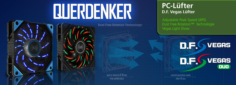 Hamburg, 30. September 2016. ENERMAX erweitert sein Lüfter-Portfolio um zwei 120-mm LED-Modelle mit patentierter Dust Free Rotation™-Technologie. Die Lüfter sind zudem mit dem für Enermax typischen, patentierten LED-Ring und einzeln ansteuerbaren Vegas Lichteffekten ausgestattet: D.F. VEGAS mit blauer LED-Beleuchtung und D.F. VEGAS DUO mit zweifarbiger Beleuchtung in Rot und Grün.