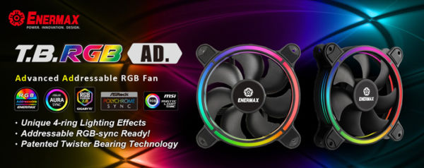 Hamburg, 27.06.19 – Die SquA RGB Lüfter-Serie mit adressierbaren RGB-LEDs verwendet die exklusive ENERMAX LED LIGHTING Technologie für eine unglaublich helle und gleichmäßige RGB-Beleuchtung. Die adressierbaren RGB-LEDs können farbenfrohe Regenbogeneffekte erzeugen und ermöglichen die Sycronisierung mit unterstützter Motherboard-Software. T.B.RGB AD. kann als eigenständiges Produkt mit dem mitgelieferten RGB-Controller eingesetzt oder mit unterstützten RGB-Motherboards von Asus, Asrock, MSI und Gigabyte synchronisiert werden. Mit der patentierten Twister Bearing-Technologie kann der T.B.RGB AD. nicht nur für ansprechende Lichteffekte sorgen, sondern auch eine hervorragend leise Kühlung bieten.