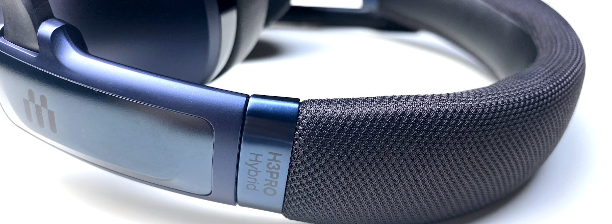 Der aus Metall gefertigte verstellbare Kopfbügel ist an der Innenseite angenehm weich gepolstert und mit Kunstleder bezogen. Die Außenseite schützt ein schwarzer Textilmantel. Dieser ist an den Seiten in dunkelblauen verschraubten Kunststoffkappen mit aufgedrucktem EPOS H3Pro Hybrid Schriftzug eingefasst.
