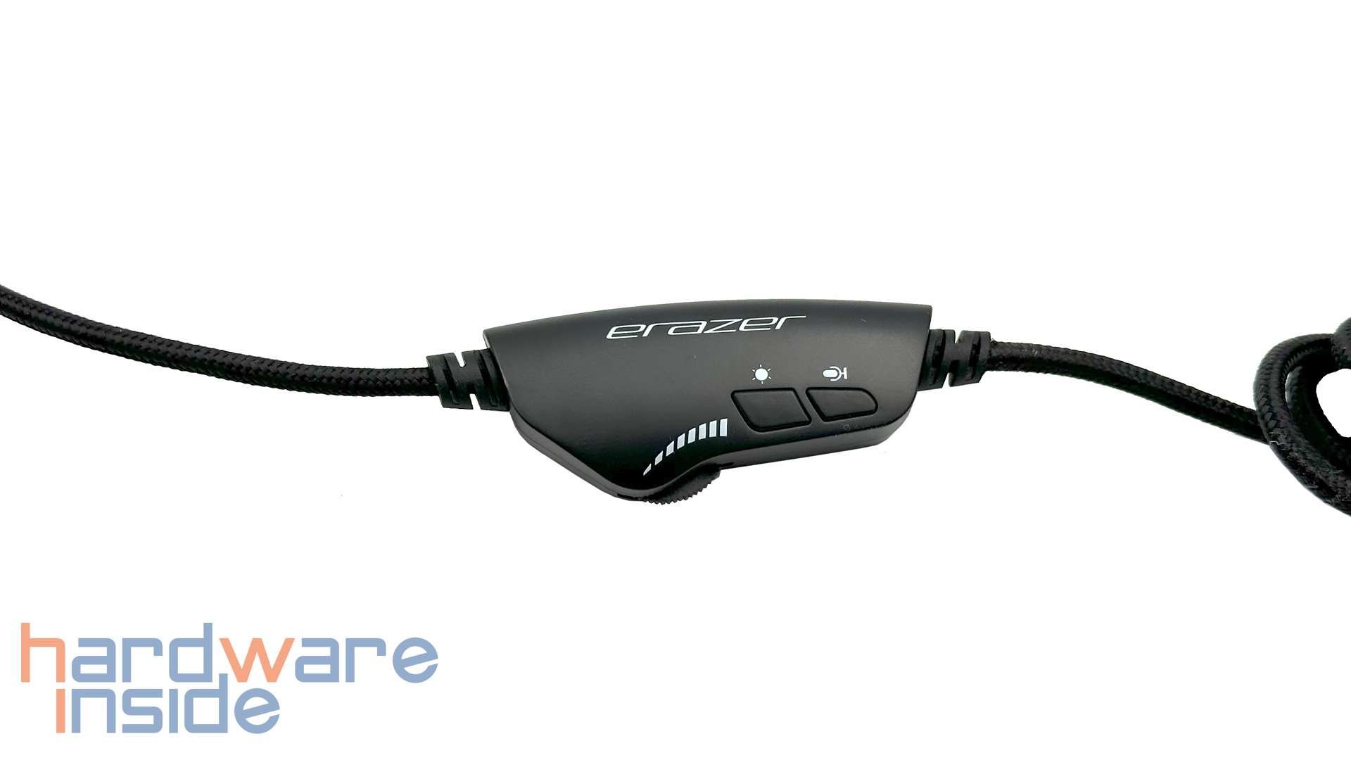 Der Kopfhörer verfügt über ein mit 240 cm recht langes Anschlusskabel. Es ist mit einem schwarzen Gewebe ummantelt. Nach etwa 30 cm der Kabellänge (ausgehend vom Headset) folgt die Kabelfernbedienung. Diese verfügt über ein Rad zum Einstellen der Lautstärke sowie zwei Tasten. Eine Taste ändert die Farbe der Beleuchtung, die andere aktiviert oder deaktiviert das Mikrofon.