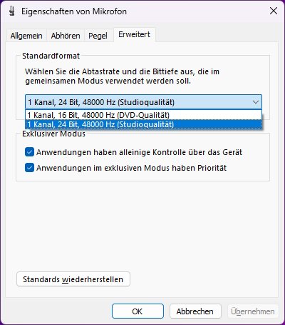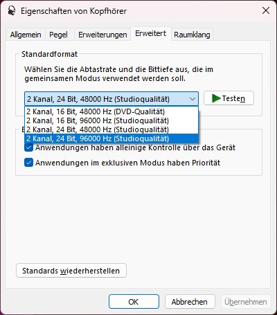 Der verbaute ES9260Q Soundchip von ESS-Technology erlaubt uns eine kleine Auswahl an möglichen Einstellungen. Vom Start weg wäre hier „2-Kanal, 16-Bit, 96.000 Hz (Studioqualität)“ ausgewählt. Diese Einstellung ändern wir auf die höchste Möglichkeit: „2-Kanal, 24-Bit, 96.000 Hz (Studioqualität)“. Der Unterschied wird sich aber vermutlich nur Nutzern mit einem geschulten Gehör eröffnen.