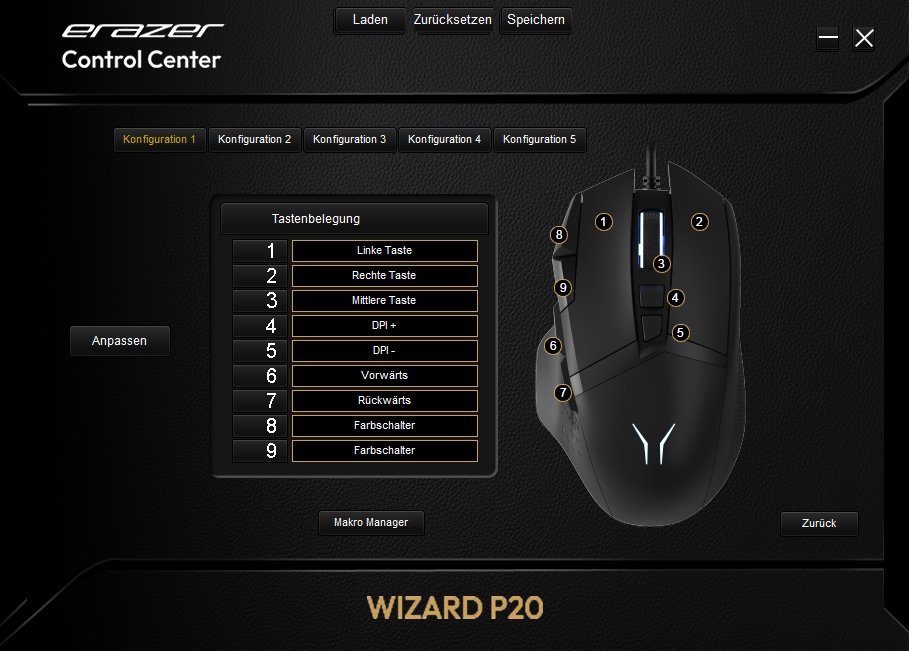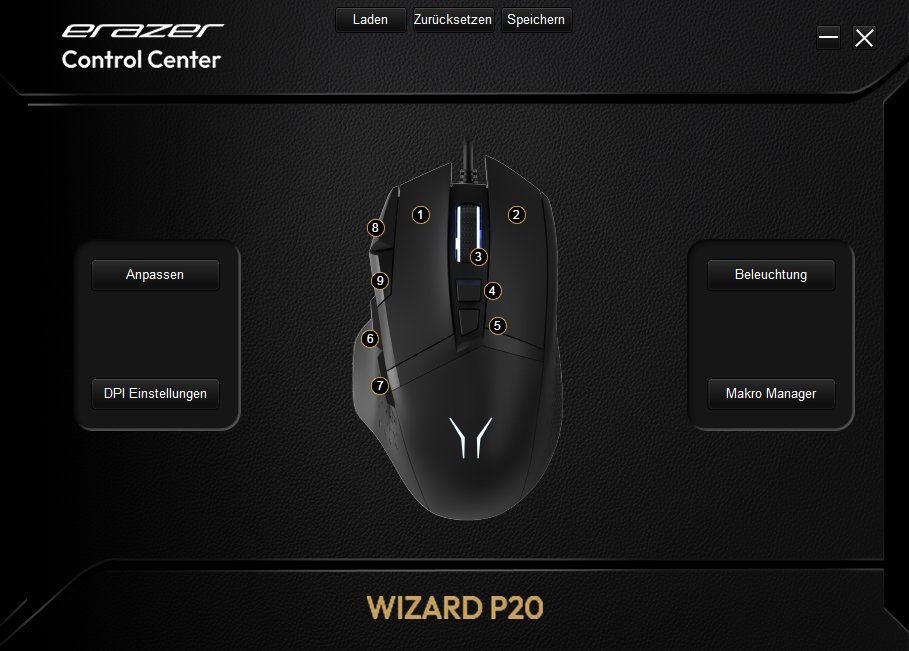 Die Erazer Wizard P20 lässt sich auch ohne Software betreiben. Wer jedoch wirklich alle Funktionen nutzen und bequem einstellen will, der wird die Software benötigen. Die Installationsdatei ist nur 5,63 MB groß und somit sehr schnell heruntergeladen. Nach der Installation nimmt die Software 66,3 MB Speicherplatz ein. Im Erazer Control Center werden wir direkt von einem Bild der Maus und der dazugehörigen Bezeichnung begrüßt. Um die Maus sind vier Schaltflächen angeordnet.
