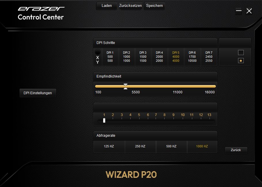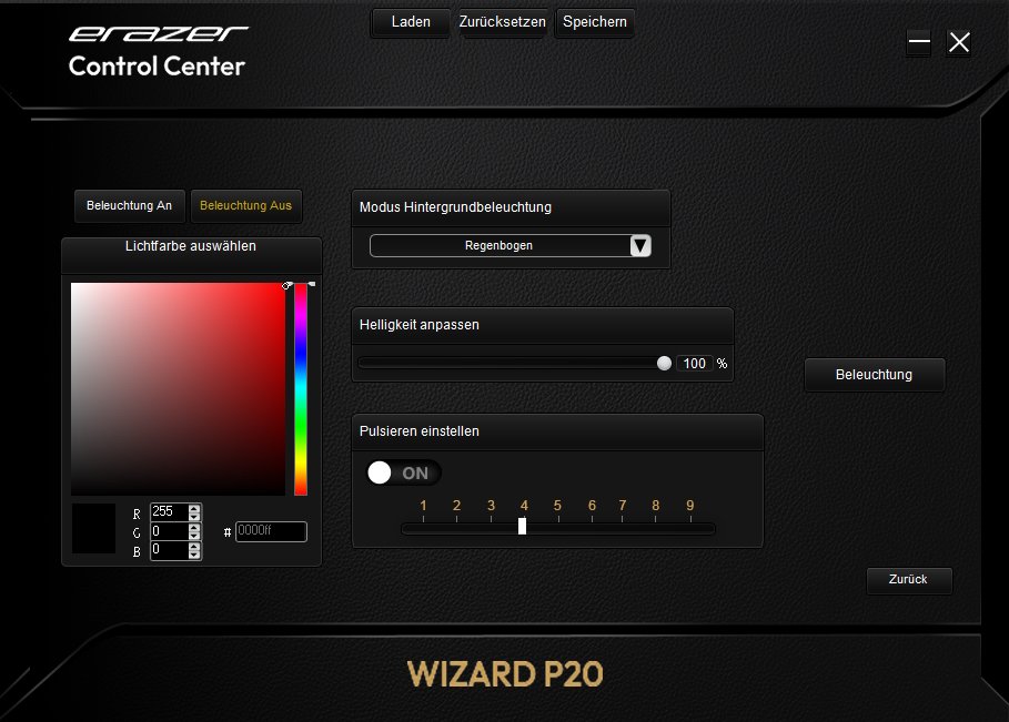 Die Erazer Wizard P20 verfügt über eine dezente Beleuchtung. Nur das Logo auf dem hinteren Bereich und die Seiten des Mausrads werden beleuchtet. Die Software erlaubt eine gute Auswahl an vordefinierten Effekten, die sich in Helligkeit und Geschwindigkeit verstellen lassen. Bei einigen Effekten ist auch das Ändern der Leuchtfarbe möglich. Allerdings lässt sich nur die Beleuchtung des Logos einstellen, die des Mausrads dagegen nicht.