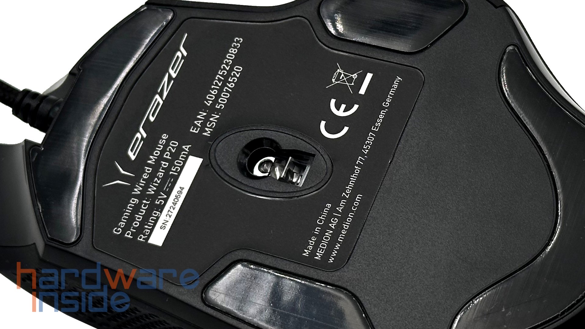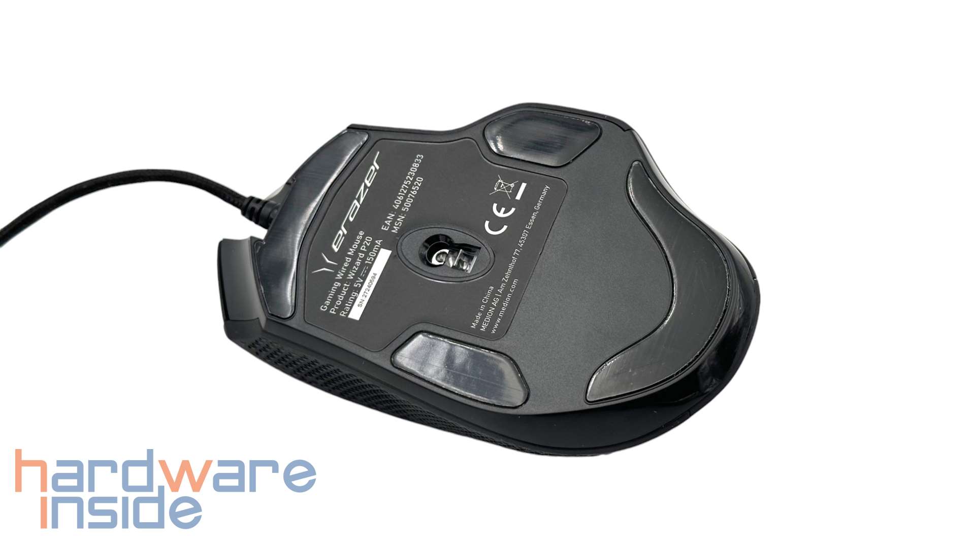 Die Erazer Wizard P20 gleitet auf zwei großen und zwei kleinen Gleitfüßen. Mittig ist der Sensor verbaut und wir eingerahmt von einem Aufkleber, welcher neben dem Herstellernamen und Modellbezeichnung auch noch ein paar kurze Informationen zeigt.