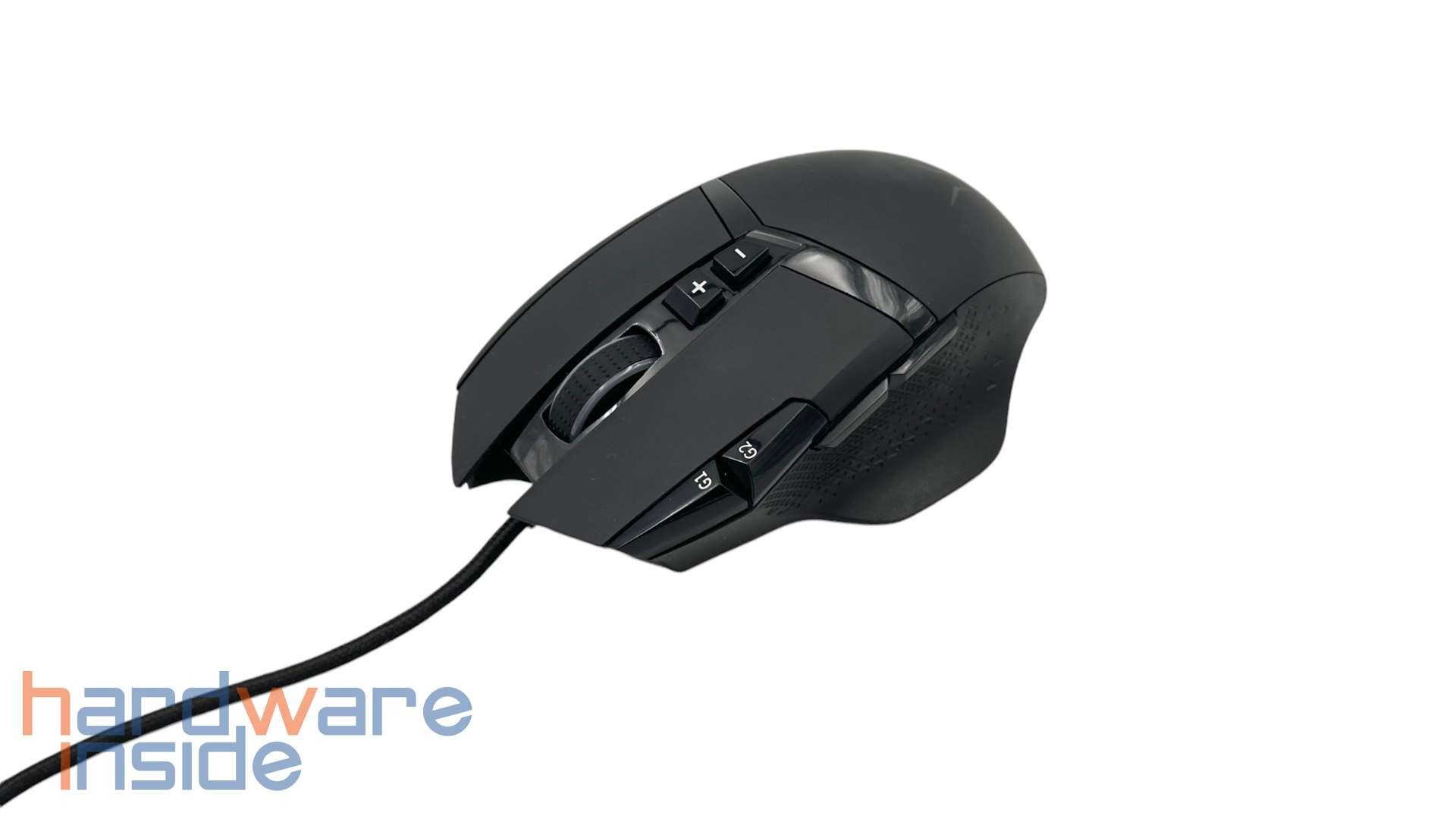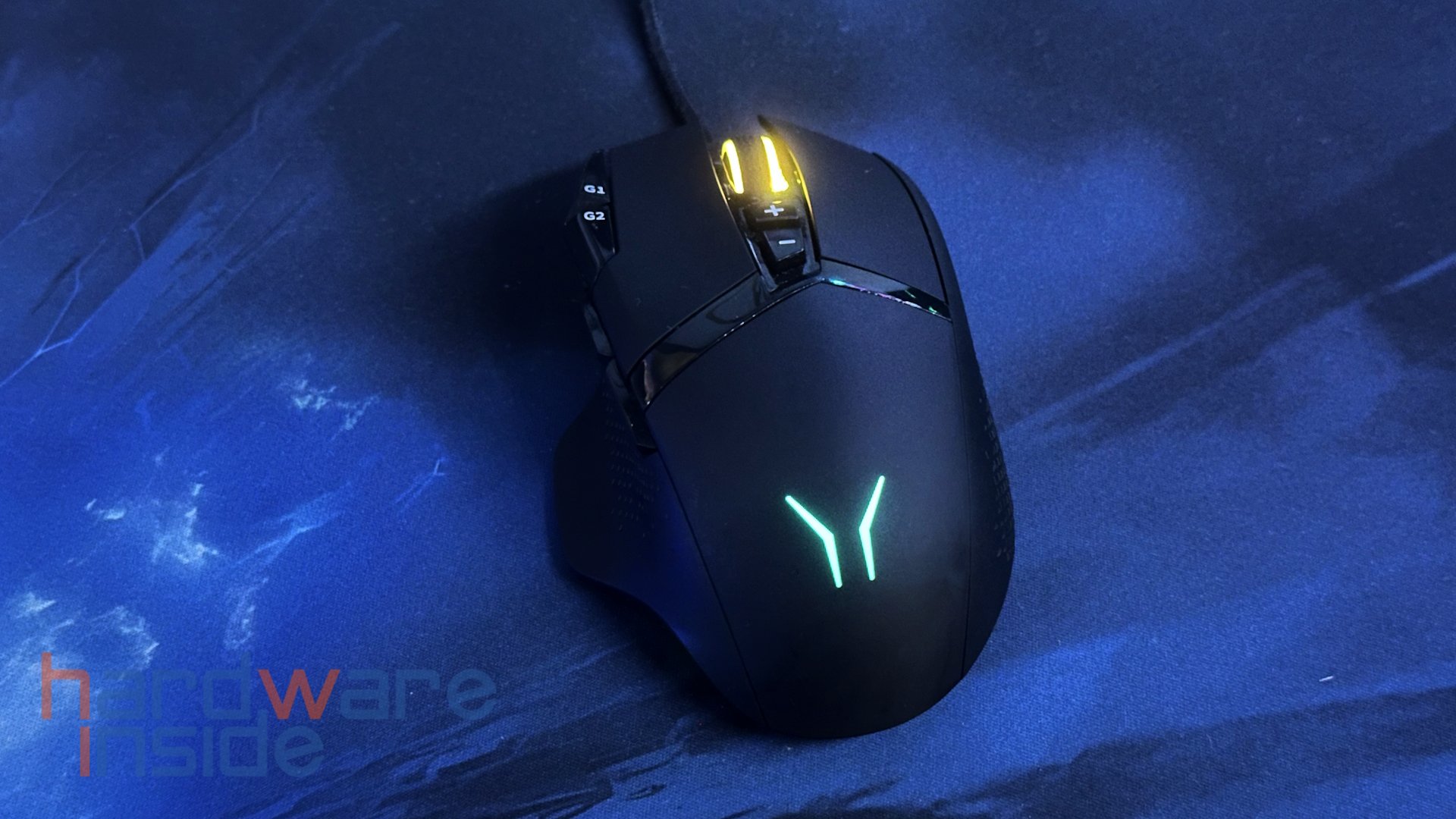 In der Draufsicht sind die großzügige Ablage für den Daumen sowie die Seitentasten sichtbar. Die beiden Tasten neben der linken Haupttaste sind mit G1 und G2 beschriftet. Das Design wirkt etwas futuristisch, ist aber zweckmäßig. Zwischen den beiden Haupttasten liegt das gummierte Mausrad, welches über eine feine Rasterung verfügt. Dahinter liegen zwei Tasten, welche jeweils mit einem Minus und einem Plus markiert sind. Diese dienen dem Wechsel der zuvor festgelegten Stufen der Auflösung. Die Oberfläche ist bis auf wenige Ausnahmen in einem matten Schwarz gehalten. Lediglich die zusätzlichen Tasten, die Tasten hinter dem Mausrad und ein schmaler Bereich in der Mitte sind hochglänzend ausgeführt. Die matten Flächen verfügen über eine Art Softlack, der sich griffig anfühlt. Auf dem Rücken trägt die Maus das Logo, welches im Betrieb mittels RGB-LEDs ausgeleuchtet wird – das Mausrad übrigen auch.