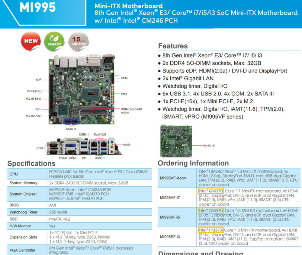Das Mini-ITX-Motherboard namens MI995 wird in vier Varianten ausgeliefert: MI995VF-Xeon (QM246) für Xeon E3, MI995VF-i7 (QM370) für Core i7, MI995VF-i5 (QM370) für Core i5 und MI995VF-i3 (HM370) für Core i3. Dieses Motherboard hat eine CPU, die in den FCBA1440 Sockel eingebettet ist.