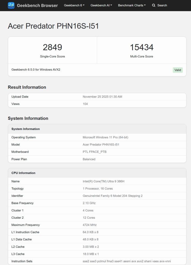 In einem System mit 64 GB RAM und einem ausgewogenen Energieprofil unter Windows 11 Pro erzielte der Prozessor im Geekbench 6.5.0 einen Single-Core-Wert von 2.849 sowie ein Multi-Core-Ergebnis von 15.434. Damit liegt der Ultra 9 386H leicht über dem Leistungsspektrum des aktuellen Arrow Lake-H Core Ultra 9 285H – rund 5 % schneller im Single-Core und etwa 9 % schneller im Multi-Core.