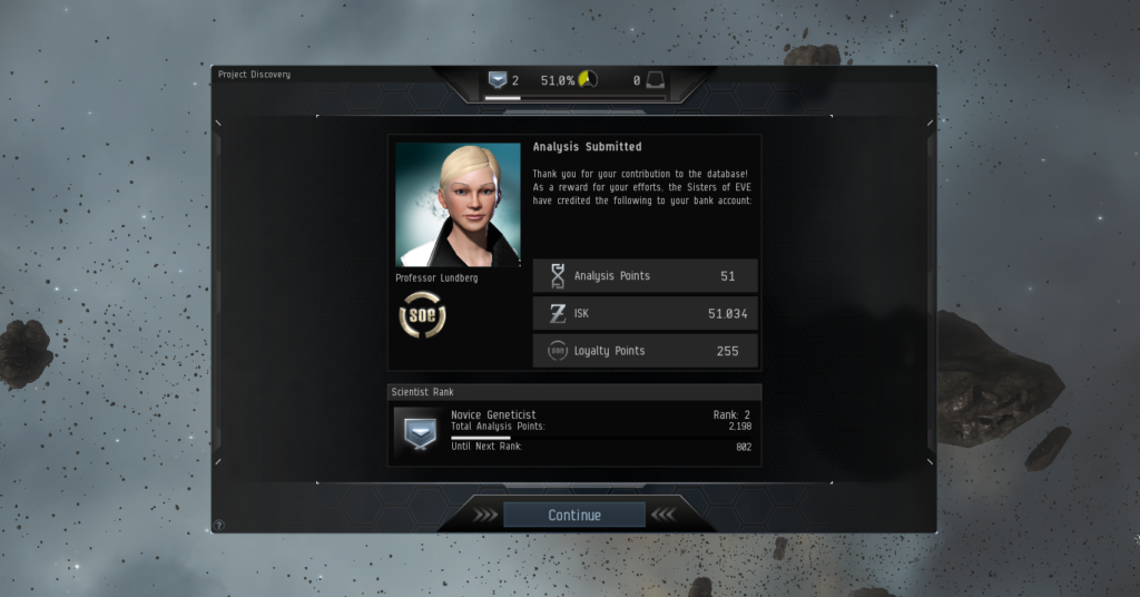 Die Durchflusszytometrie-Technik von Project Discovery, die 2020 eingeführt wurde, um die COVID-19-Forschung zu beschleunigen, hat über 900.000 EVE Online-Spieler:innen dazu veranlasst, wesentliche Beiträge zur wissenschaftlichen Forschung zu leisten. Project Discovery wird weiterhin täglich von der EVE Online-Community in erheblichem Umfang unterstützt.