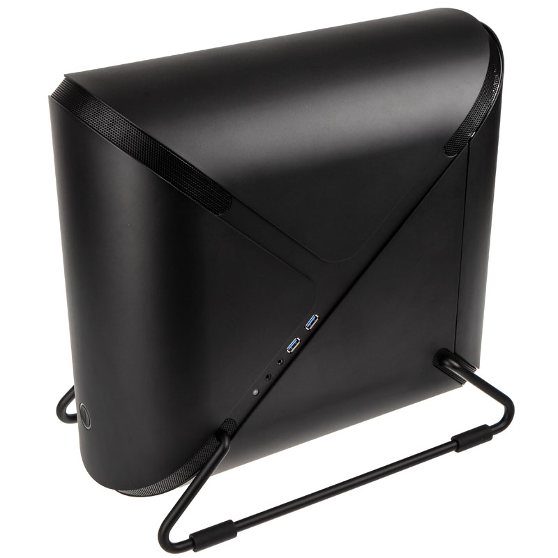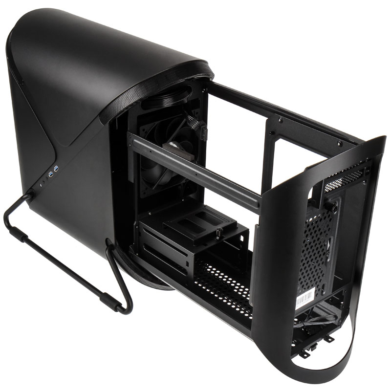 Ein 2,5-Zoll-Laufwerk sowie zwei 3,5-Zoll- bzw. 2,5-Zoll-Laufwerke lassen sich in einem kompaktem Festplattenkäfig verbauen und für die Stromversorgung sieht das Portal ein Netzteil im SFX-Format vor. Das seitlich befindliche I/O-Panel bietet zudem zwei USB-3.0-Ports sowie HD-Audio-Anschlüsse für Mikrofon und Kopfhörer. Um verbaute Hardware entsprechend kühlen zu können, wird die Luft an allen vier Ecken sowie über den Boden des Gehäuses angesogen. Unterstützt wird es dabei von einem 120-Millimeter-Lüfter in der Front sowie einem 80-Millimeter-Lüfter an der Rückseite, wobei letzterer dafür verantwortlich ist, die aufgewärmte Luft wieder aus dem Gehäuse zu transportieren. Alternativ kann an der Front, anstelle des Lüfters, auch ein 120-Millimeter-Radiator montiert werden, wodurch sich die CPU auch via Komplett-Wasserkühlung kühlen lässt.