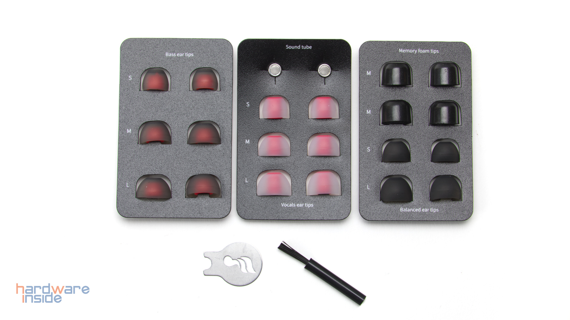 Der Inhalt fällt für einen In-Ear Kopfhörer unüblich groß aus, der beigelegte Quick Start Guide ist dabei der uninteressanteste Teil. Neben dem FD3 liegt eine Plastikbox im Karton, in der das gesamte Zubehör enthalten ist. Darunter befinden sich drei Sätze an Ohrstücken, die sich nicht nur farblich, sondern auch akustisch voneinander unterscheiden sollen. Zusätzlich liegen sogenannte Sound Tubes bei, welche in den FD3 alternativ zu den bereits verbauten gesteckt werden können. Sound Tubes mit geringerem Durchmesser sollen dabei den Bass verstärken, während ein größerer Durchmesser für besonders detaillierte Höhen sorgt. Ein beigelegter Pinsel ermöglicht die Reinigung der Kopfhörer, während es das Werkzeug deutlich erleichtert, die FD3 über den MMCX-Anschluss vom Kabel zu lösen.