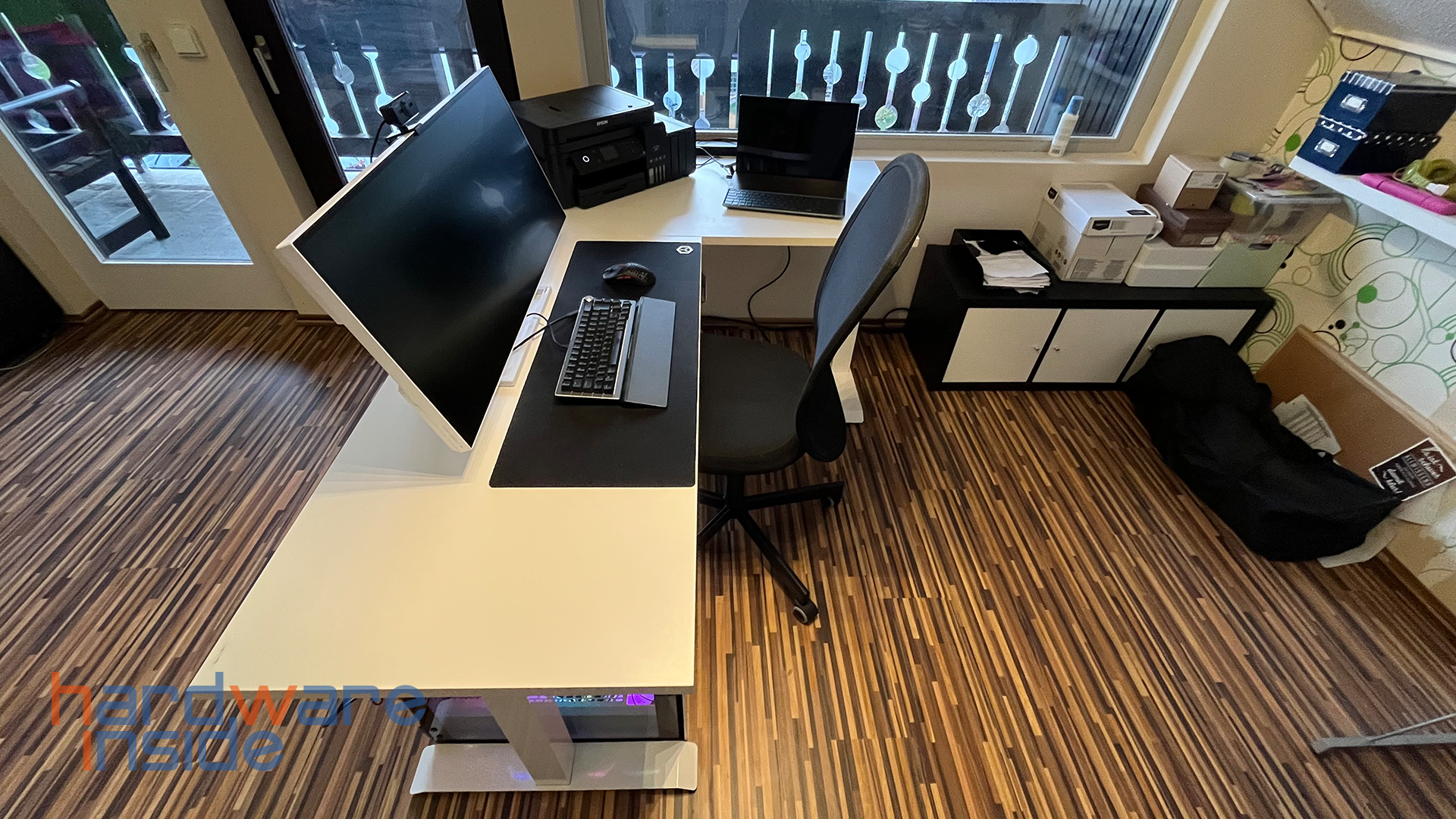Bei der Bestückung des Schreibtisches ist darauf zu achten, dass das Gewicht der Tischplatten in der Kalkulation Berücksichtigung findet. Je nach Platten können gut und gerne 30 Kilogramm berechnet werden. Hinzu kommen Monitor, Drucker, Bücher, Ablagen und Peripherie. In unserem Fall müssen wir uns jedoch keine Sorgen machen, denn bis 150 Kilo Traglast ist noch viel Luft nach oben.