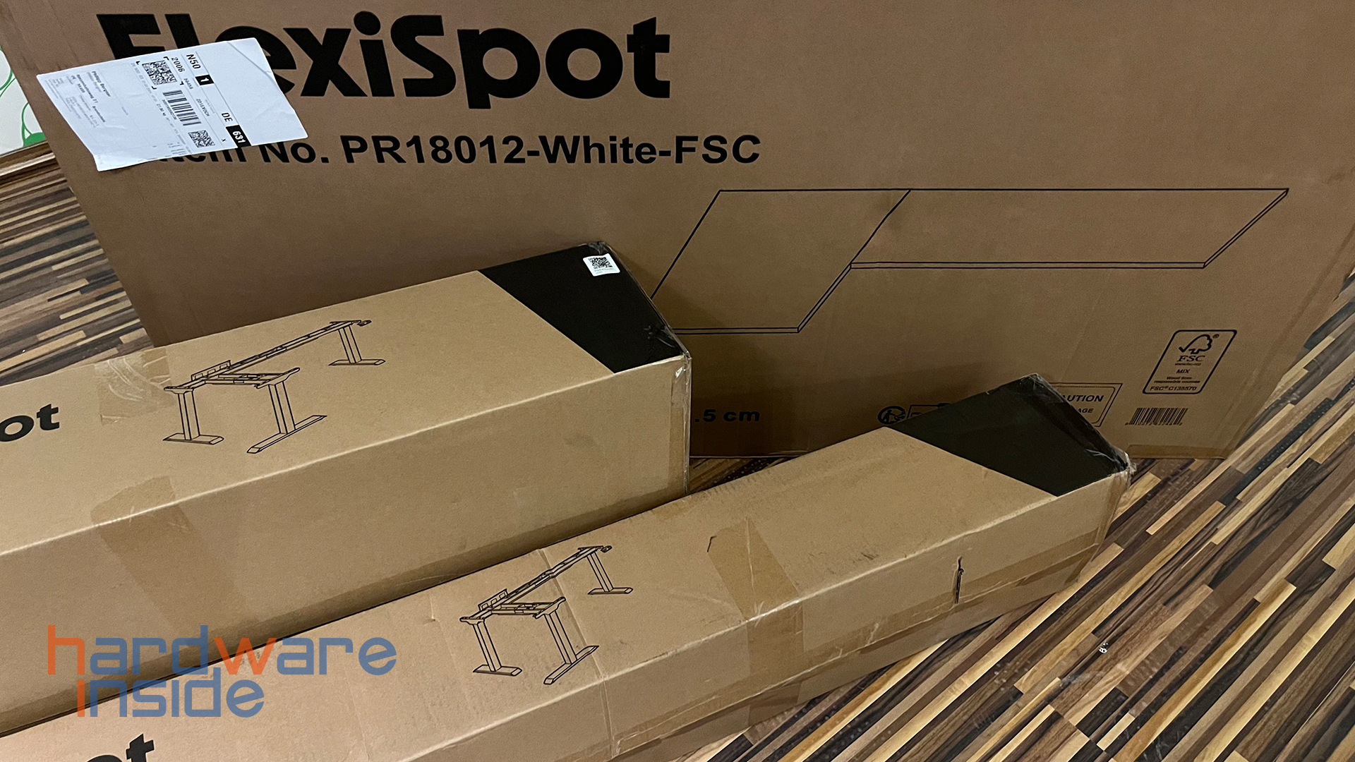 Der Flexispot E7L wird in drei Teilen geliefert. Zum einen erhalten wir einen knapp 30 kg schweren Karton, welcher die Hubsäulen beinhaltet, zum anderen ein Paket mit 26 Kilo Gesamtgewicht mit dem restlichen Gestell. Wir haben uns für die Farbe weiß entschieden. Alternativ kann hier darüber hinaus auch ein schwarzes oder graues Tischgestell geordert werden. Das dritte Paket beinhaltet die Tischplatte, welche wir ebenfalls in weiß zugestellt bekommen haben. Falls euch diese Farbe nicht zusagt, könnt ihr sie auch in schwarz ordern oder die Tischplatte komplett vernachlässigen und eure eigene Platte verwenden.