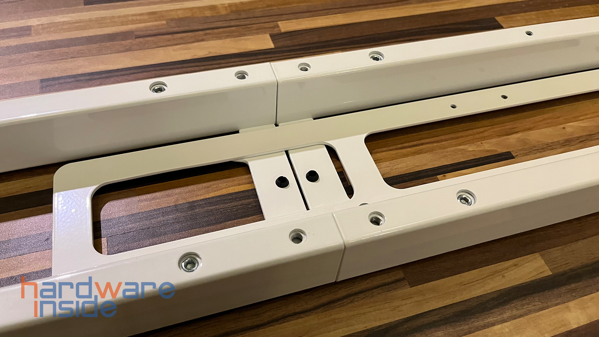 Wurde sauber gearbeitet, erschließt sich ein wunderbares und präzises Bild beider Platten. Diese liegen exakt nebeneinander auf. Für alle, die hier etwas genauer hinschauen: Die Platte von Flexispot weist keine ultraglatte Oberfläche auf, sondern hat etwas Struktur, damit beispielsweise ein Mauspad besser hält oder Monitor, Drucker etc. einen sicheren Stand haben. Uns gefällt diese Optik und Haptik sehr. Insgesamt verfügt die Platte auf der Unterseite bereits über Bohrungen, sodass recht eindeutig ist, wie die Platte an das Basismodul angebracht werden muss.