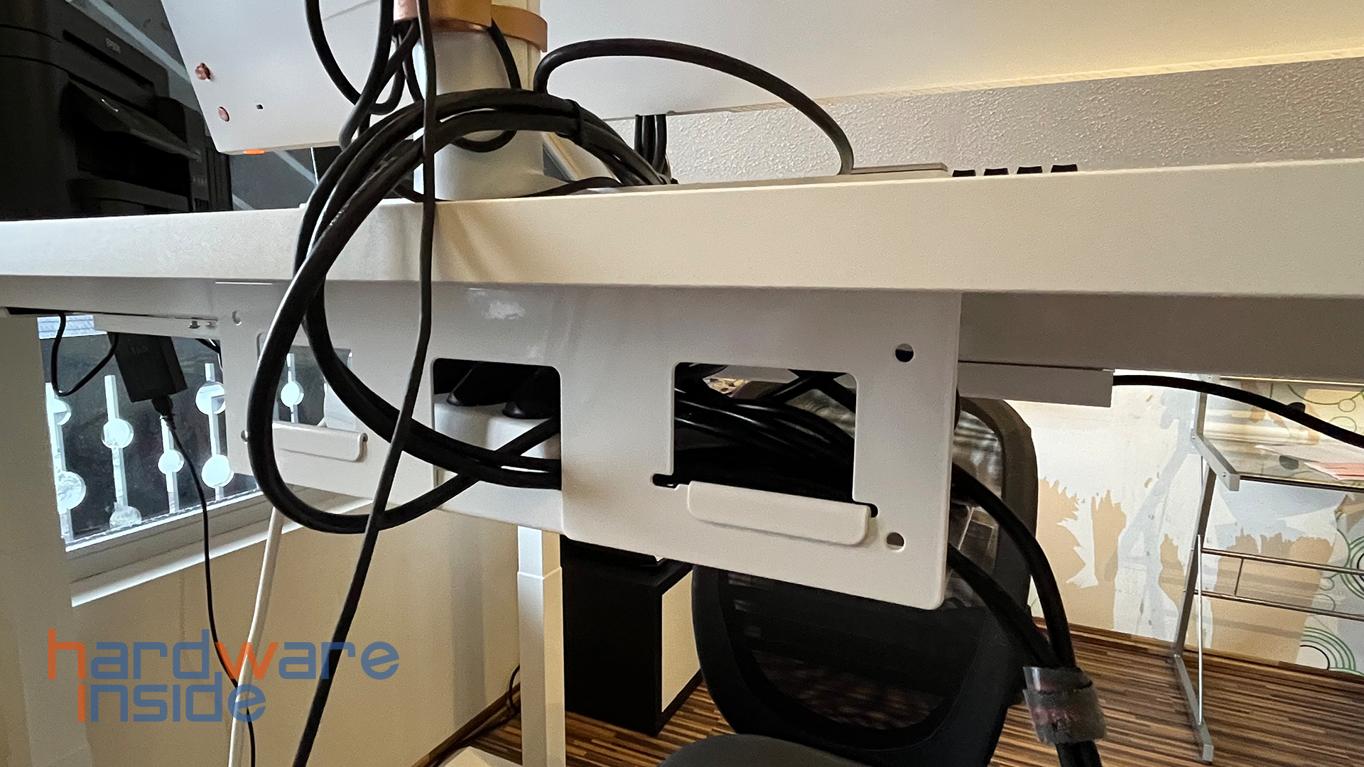 Der E7L zeichnet sich in unserem 32 qm großen Büro durch eine hohe Flexibilität aus. So können in Zukunft zwei dieser Schreibtische spiegelverkehrt zueinanderstehend oder nebeneinanderstehend platziert werden. Da wir für den Flexispot eine Stromquelle benötigen, sollte dieser ohne Bodendosen nicht in der Mitte des Raumes platziert werden. Im Sinne des Kabelmanagements kann das Stromkabel unter der Tischplatte so verlegt werden, dass es später unsichtbar ist, doch Vorsicht: Es sollte nicht straff verlegt werden oder ohne Puffer fixiert werden. Da der E7L massiv in der Höhe verstellt werden kann, besteht hier die Gefahr einer Beschädigung.