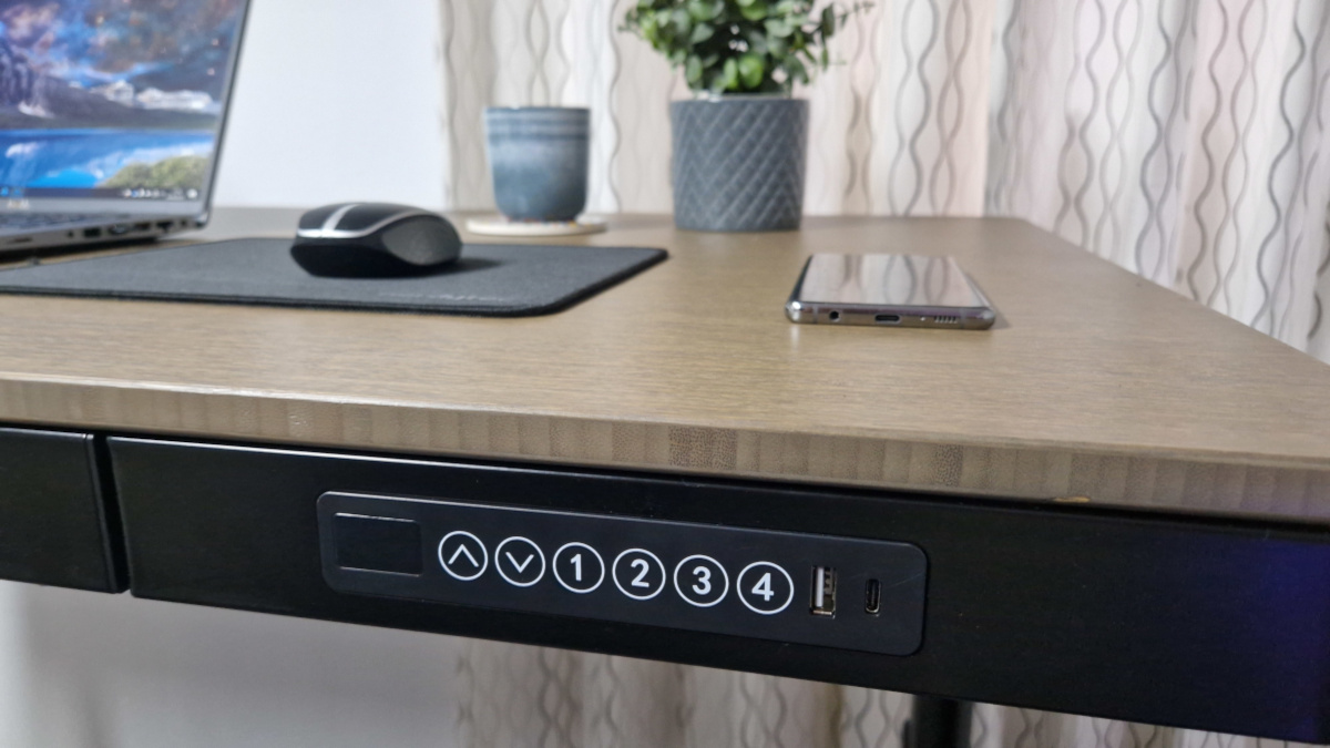 Die vormontierte Steuerung ähnelt der des Vorgängers, unterscheidet sich jedoch in einigen Punkten. Die Tischsteuerung des Q8 besitzt statt 2 USB-A-Steckplätzen nur einen USB-A-Anschluss und die Kindersicherung vom FlexiSpot EW8 wurde beim neuen Modell entfernt. Ansonsten bleibt ein Display, das die aktuelle Höhe in cm anzeigt, zwei Tasten, die den Tisch rauf- und herunterfahren, vier Tasten zum Speichern der Tischhöhe und ein USB-C-Steckplatz. Das neue Design des Q8 bringt nicht nur farblich eine Änderung, sondern erspart die Zwischenstrebe am unteren Teil der Hubsäulen, was für einen minimalistischen und stilvollen Look sowie für mehr Beinfreiheit sorgt.