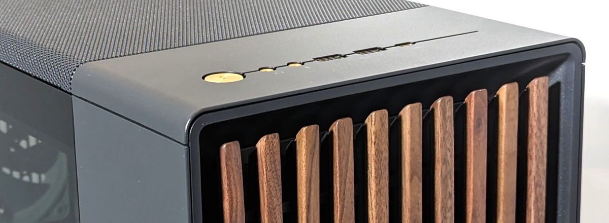 Die Front des Fractal North schmückt sich mit dunklen Walnuss-Holzstreben auf dunklem Plastik. Dank der Streben besteht hier enormes Airflow-Potenzial und mit dem dahinter sitzenden Filter ein Staubschutz. Die Front lässt sich einfach durch eine Aussparung am unteren Ende entfernen und in zwei Einzelteile zerlegen. Dies ermöglicht direkten Zugriff auf den Staubfilter und die zwei vorinstallierten Fractal Aspect 14 PWM Lüfter.