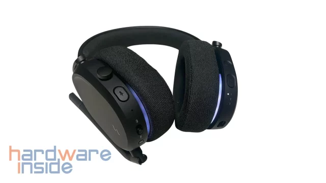 Die Bedienung des Scape erfolgt über die an den Seiten eingelassenen Tasten. Auf der rechten Seite befinden sich oben eine Taste zur Steuerung der RGB-Beleuchtung und direkt darunter eine Taste für die Bedienung des Equalizers. Über die drei darunter befindlichen LEDs zeigen an, welcher Equalizer-Modus aktiv ist. Unten in der Mitte ist eine USB-C-Buchse verbaut, über die das Headset geladen oder über Kabel z. B. direkt mit dem PC verbunden werden.