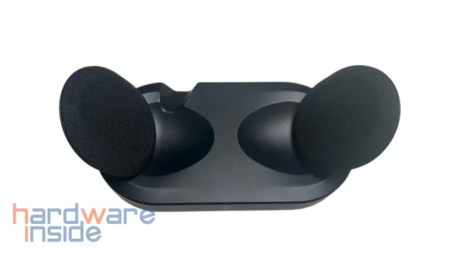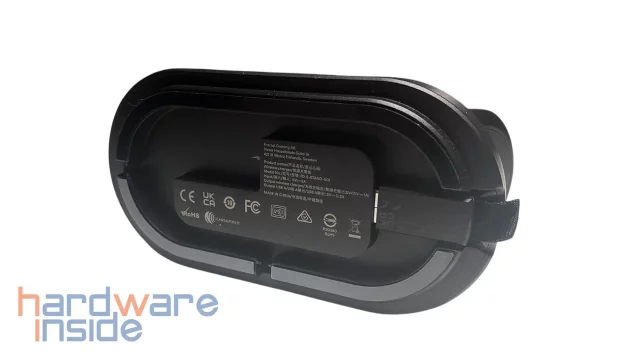 An der Unterseite ist eine USB-C und eine USB-A Buchse. Der Funkempfänger steckt im Auslieferungszustand in der USB-A-Buchse und kann auch dort verbleiben, wenn die Dockingstation über den USB-C-Anschluss zum Beispiel mit dem PC verbunden wurde, da diese für die Ladefunktion genutzt wird. Der Runde Stand-Fuß dient gleichzeitig auch als Kabelführung.