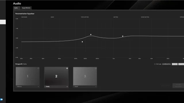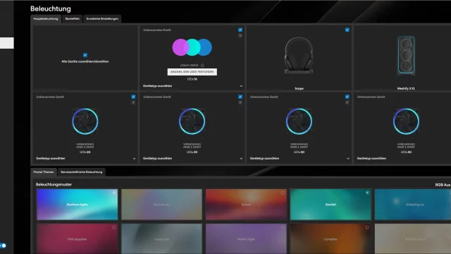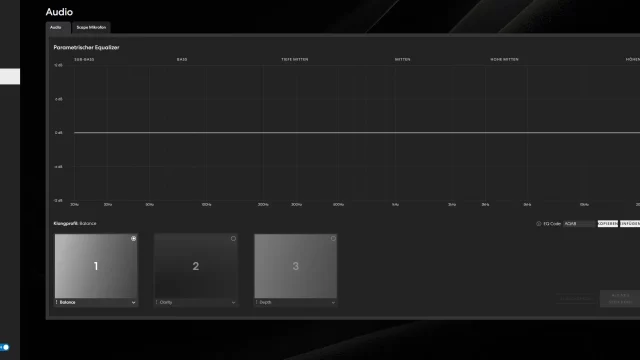 Die Konfiguration des Scape ist in zwei Kategorien unterteilt. In der ersten Kategorie Beleuchtung kann die Beleuchtung der beiden Lichtleisten eingestellt werden. Durch den Einsatz von ARGB Gen 2 LEDs lassen sich interessante Lichteffekte einstellen. Die zweite Kategorie Audio ermöglicht die Anpassung des Klangs durch die Konfiguration des Equalizers. Hier stehen dafür drei Profile zur Auswahl. Über den Unterpunkt Scape Mikrofon, kann die Rauschunterdrückung und die Mithörfunktion angepasst werden. Die Einstellung lassen sich dort auch testen.