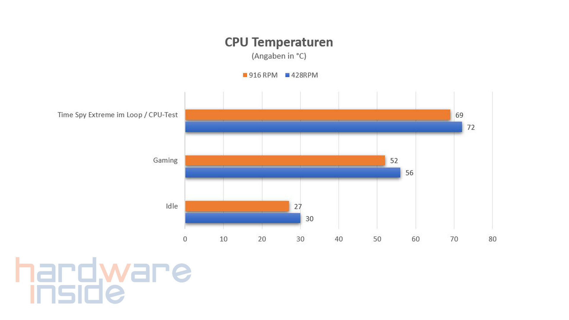 Wir wollen auch ermitteln, wie sich die Temperaturen im Betrieb verhalten. Dazu legen wir einen festen Wert von 2025 RPM der verbauten Pumpe sowie 1150 RPM der zwei 140 mm Lüfter fest. Bei den vier ab Werk installierten 140 mm ARGB-Lüftern ermitteln wir die Mindestdrehzahl, die bei 0 RPM (Laut Mainboard-Software) und 100 % Lüfterdrehzahl, welches 916 RPM entspricht. Ein 0-Zero Fan-Betrieb ist aus unserer Sicht doch eher als kontraproduktiv anzusehen, daher entschieden wir uns für den Min. Wert von 30%, das 428 RPM entspricht. Wie auf den Diagrammen zu sehen ist, bewegen sich die Temperaturen der CPU und Grafikkarte im guten Bereich, wobei unsere Grafikkarte nie wärmer als 55° Grad wurde. Aufgrund des guten Airflows erreichte unser Testsystem zu keinem Zeitpunkt kritische Werte. Auch bei der Lautstärke erreichen wir gute Werte. Bei 700 RPM Lüfterdrehzahl erhalten wir mit unserer Konfiguration das beste Ergebnis in Bezug auf Kühlung, Leistung und die Lautstärke. Selbst bei voller Drehzahl von 916 RPM, war es zu keiner Zeit als störend zu empfinden. Dabei sollte aber bedacht werden, dass je nach Einsatz der Lüfter-Modelle, hier auch Temperaturen und eine andere Geräuschkulisse entstehen können.