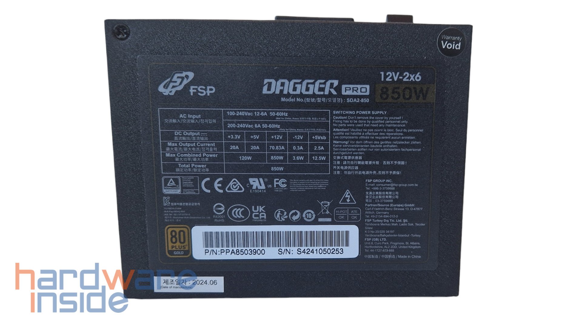 Das Typenschild des FSP DAGGER PRO 850W ist in Form eines rechteckigen Aufklebers oberhalb des Gehäuses angebracht, welches alle relevanten Daten und der 80 Plus Gold-Zertifizierung sowie diverser Prüfsiegel des Netzteils enthält.