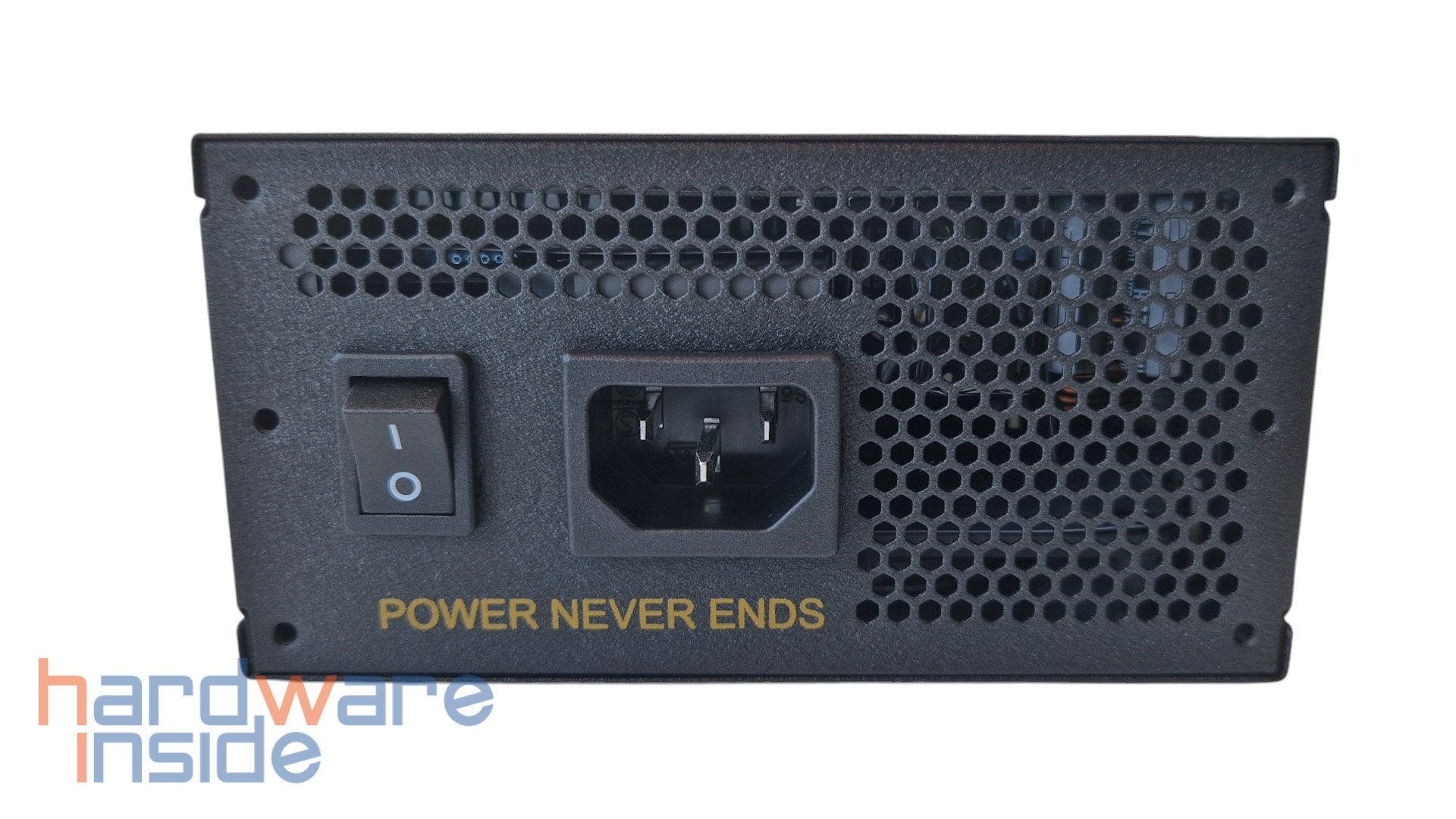 Auf der Rückseite sind alle Bereiche außer dem Stromanschlussbereich vollständig mit Bohrungen in Wabenform perforiert. Nur der Bereich, in dem die dreipolige Kaltgerätestecker-Buchse untergebracht ist, hat kein Lochmuster.