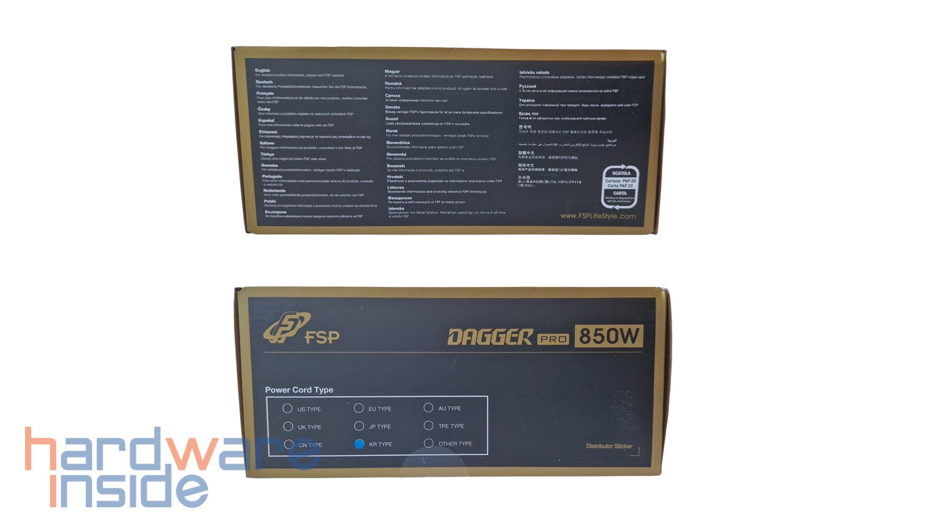 Die Lieferung des FSP DAGGER PRO 850W erfolgt in einer Kartonage in Schwarz mit goldenen Akzenten. Die Vorderseite präsentiert ein detailliertes Produktfoto sowie das Herstellerlogo, die Typenkennzeichnung, Informationen über die verwendeten japanischen E-Kondensatoren und den Betrieb des Semi-Lüfters. Des Weiteren sind dort Angaben zur Leistung, den Standards sowie zur Zertifizierung nach dem Standard 80+ Gold enthalten; zusätzlich wird eine Herstellergarantie von zehn Jahren vermerkt. Auf der Rückseite wird kurz auf die +12V Single Rail eingegangen sowie auf die Merkmale der verbauten Komponenten, welche durch vier kleine Bilder illustriert werden. Eine umfassende Liste des Features des DAGGER Pro sowie diverse Prüfzeichen sind ebenfalls aufgeführt.