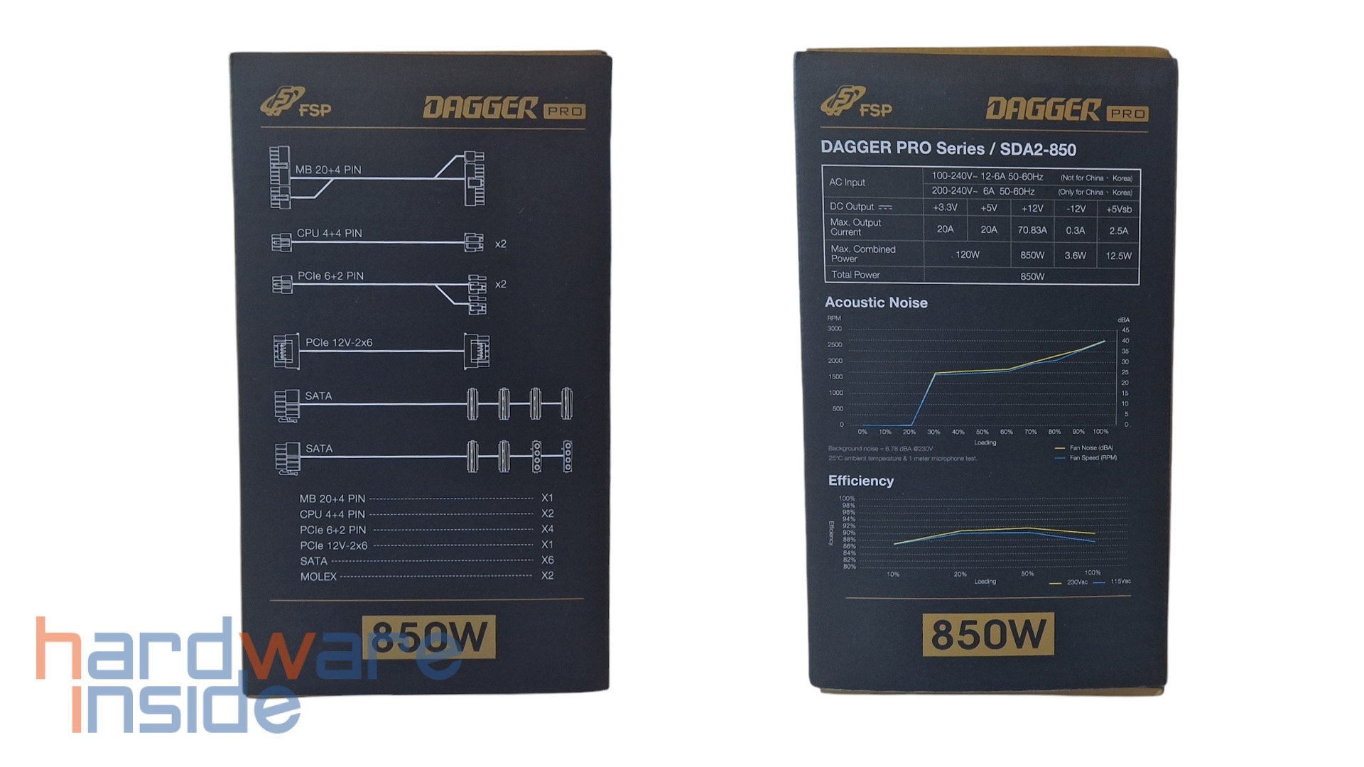 Auf einer der Stirnseiten ist die Anzahl der beiliegenden Kabel als Grafik mit Tabelle und auf der anderen Seite sind die technischen Daten- der Geräuschpegel- und der Effizienz des FSP DAGGER PRO 850W in Form einer technischen Tabelle zu finden.