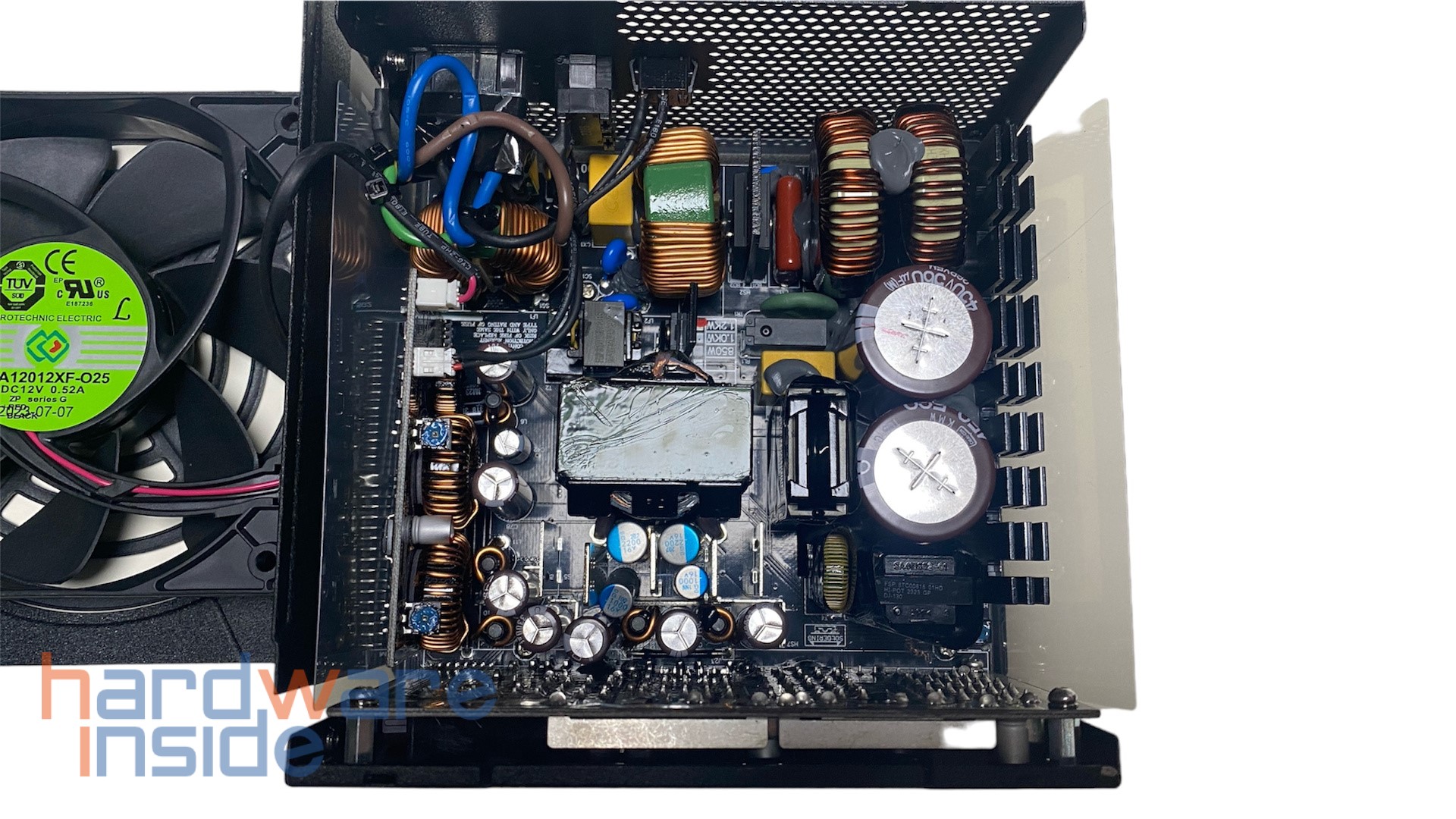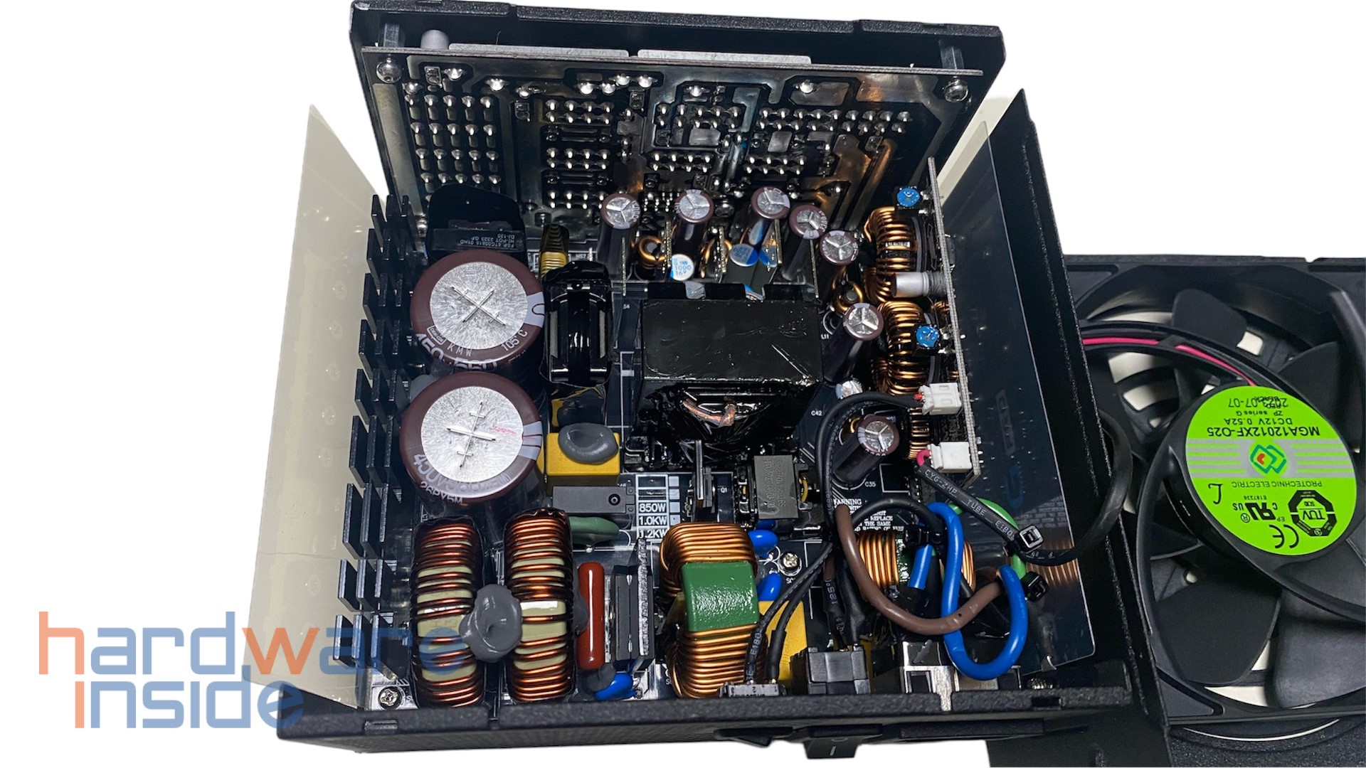 Ein Blick ins Innere zeigt das schwarze PCB, das auf drei Platinen aufgeteilt wurde. Wie auf dem Bild zu sehen ist, kommen hochwertige Bauteile wie z. B. japanische Polymer- und Elektrolyt-Kondensatoren zum Einsatz, die bis 105 °C temperaturstabil arbeiten. Die Leistungstreiber sind mit großen schwarzen Kühlkörpern versehen und so angeordnet, dass sie gut im Luftstrom stehen. Dadurch kann die Wärme effizient abgeführt werden. Zusätzlich ist das Hydro G Pro mit Schutzbeschichtungen versehen, um eine zuverlässige Leistung in einer rauen Umgebung zu gewährleisten. Es funktioniert dadurch auch bei 95 % relativer Luftfeuchtigkeit.