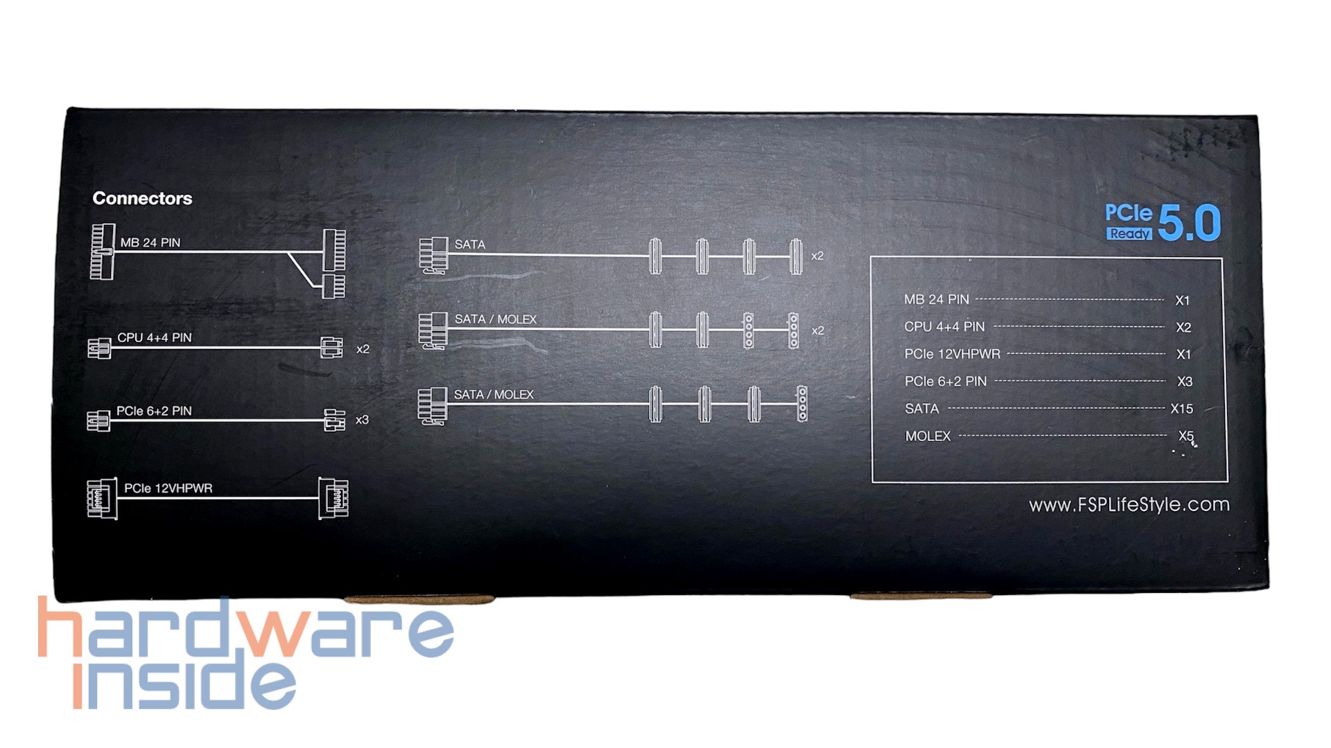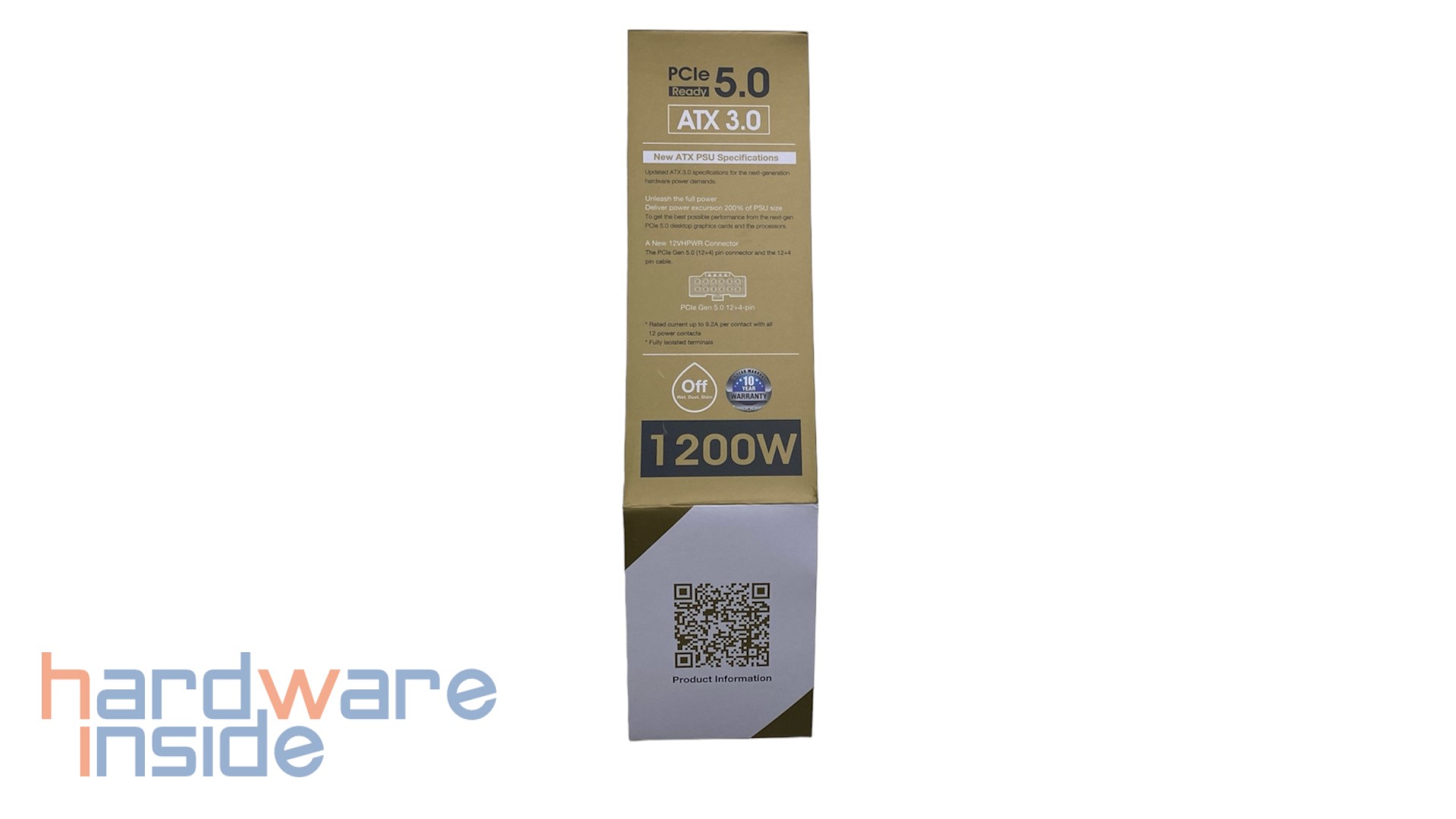Auf der Stirnseite befinden sich in der rechten oberen Ecke die Produktbezeichnung und der PCIe 5.0 Ready Hinweis. Darunter sind die Anschlussbuchsen für die entsprechenden Kabel in vier Bereiche aufgeteilt. So sind die fünf Anschlüsse für die Peripherie, die drei PCIe Geräte mit dem neuen 12 VHPWR, den beiden achtpoligen Buchsen für die CPU sowie des Mainboards von links nach rechts angeordnet. Ein falsches Anschließen der Stecker ist aufgrund der verschiedenen Bauformen nicht möglich.
