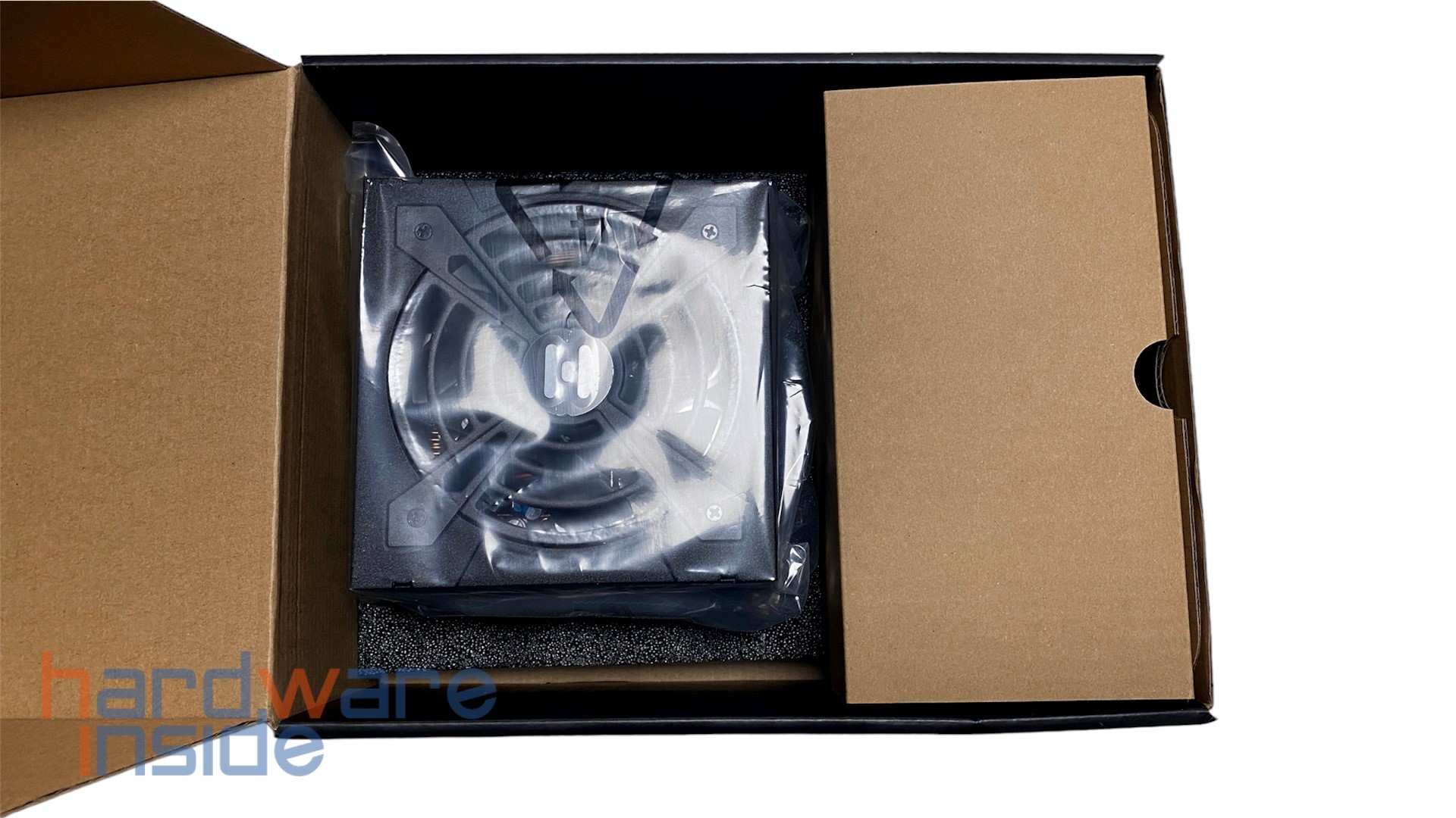 Direkt auf den ersten Blick fällt die gute Verarbeitung des nur 150 x 150 mm großen Kraftzwergs in Auge. Das komplette Gehäuse des Hydro G Pro ist mit einer matten anthrazitfarbenen Beschichtung versehen. Das Lüftergitter ist aus einem ausgestanzten Blech gefertigt und schließt bündig mit der Oberseite des FSP-Netzteils ab. Mittig auf dem Lüftergitter ist eine Metallplatte mit einem stilisierten „H“ angebracht. Unter dem Lüftergitter kann man die Lüfterblätter des im Inneren verbauten 120 mm Lüfters sehen.