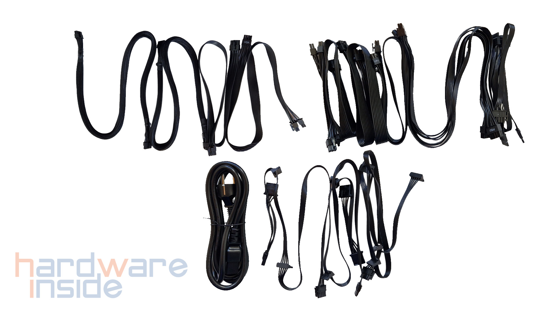 FSP stellt sämtliche potenziell erforderlichen Kabel für ein System zusammen mit dem Netzteil zur Verfügung. Mit Ausnahme der beiden dickeren und gesleevten PCIe 5.0 (12VHPWR) Kabel handelt es sich bei allen anderen um Flachbandkabel. Die Flexibilität von Flachbandkabeln erleichtert sowohl die Handhabung als auch das Verlegen der Leitungen.