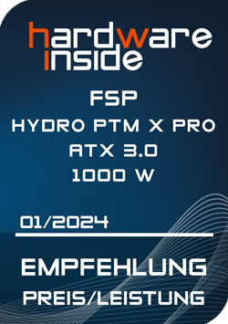 FSP hat mit dem Hydro PTM X PRO gezeigt, dass klein auch groß sein kann. So ist es nicht nur wegen der 80+ Platinum Zertifizierung besonders effizient, auch die leistungsstarke +12V Single Rail für volle und stabile Leistungen sprechen hier für sich. Mit dem Eco-Betrieb wird der Verbrauch geringer, ist flüsterleise und das bei weniger als 30 % der Auslastung des Netzteiles. Die Verarbeitung lässt hier keine Wünsche offen und durch die spezielle Oberflächenbeschaffenheit ist auch noch der Einsatz mit hoher Luftfeuchtigkeit gewährleistet. Durch seine kompakten Abmessungen, und seinem voll modularen Kabel-Management ist das Netzteil somit ideal auch für kleinere Systeme und eine 10-jährige Garantie gibt es zudem obendrauf. Derzeit ist das Netzteil mit 203 € im Preisvergleich gelistet. Betrachtet man die Verarbeitung, die Leistung, die Zertifizierung und das Gesamtpaket im Ganzen, so vergeben wir gerne unsere Empfehlung und den Preis/Leistung-Award.