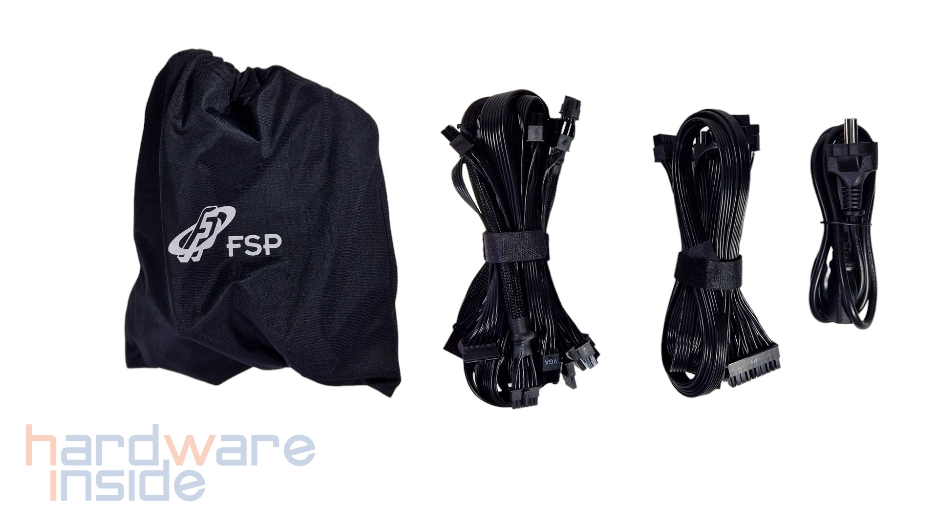 FSP liefert das Netzteil mit allen Kabeln, die für ein System benötigt werden könnten. Bei allen Kabeln handelt es sich um Flachbandkabel, abgesehen des PCIe 5.0 (12VHPWR). Das ist dicker und zugleich gesleevt. Flachbandkabel haben natürlich gegenüber dem Normalkabel den Vorteil, zum einen Flexibilität in der Handhabung und zum anderen auch bei dem Verlegen der Leitungen.