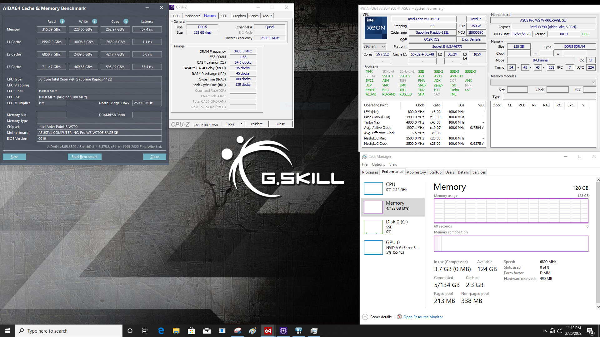 Mit dem Ziel, den schnellstmöglichen Speicher zu eifern, demonstriert G.SKILL auch das hohe Bandbreitenpotenzial von übertakteten R-DIMMs auf DDR5-6800 CL34-45-45-108 im 8-Kanal auf dem ASUS Pro WS W790E-SAGE SE-Motherboard und einem Intel Xeon W9-3495X-Prozessor, wobei im AIDA64-Bandbreiten-Benchmark unglaubliche 315 GB/s Lese-, 228 GB/s Schreib- und 262 GB/s Kopiergeschwindigkeit erreicht werden.
