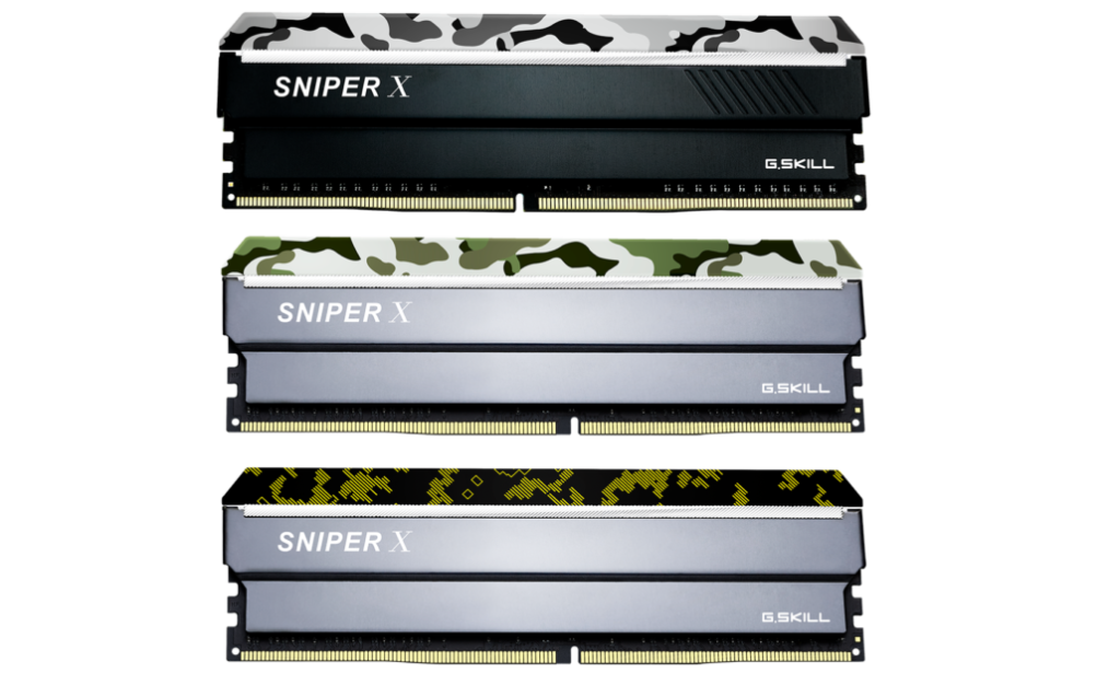 Taipei, Taiwan (3. Januar 2018) – G.SKILL International Enterprise Co, Ltd., der weltweit führende Hersteller von extrem leistungsfähigen Speicher- und Gaming-Peripheriegeräten, bringt den neuen DDR4-Speicher der Sniper X-Serie auf den Markt, der mit 3 verschiedenen Tarndesigns und Geschwindigkeiten bis zu DDR4-3600 MHz erhältlich ist. Diese neue Familie von High-Performance-Speicherkits ist ideal für Speicher-Upgrades oder für den Bau von PC-Gaming-Rigs und kundenspezifischen Systembuilds.