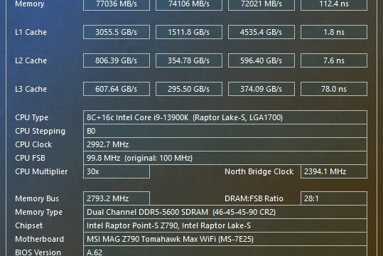 Out of the Box kommt das G.SKILL Trident Z5 Royal Kit mit einem JEDEC-Profil von 5600 MT/s. Dabei testen wir im nächsten Schritt unser erstes Szenario mit Standard-Einstellungen im BIOS in Bezug auf den 13900K ohne Standard-Boost und dem JEDEC-Profil. Dabei erhalten wir einen Durchsatz von 77036 MB/s beim Lesen, 74106 MB/s beim Schreiben und 72021 MB/s beim Kopieren mit einer Latenz von 112,4 ns. Der Cinebench R23 liefert uns hier 19150 Points im Multi-Core und 1112 Points im Single-Core.