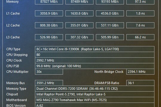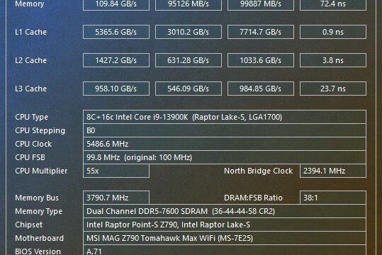 Nach längerem Herantasten können wir eine Sweet-Spot-Geschwindigkeit von 7600 MT/s für ein stabiles System erreichen. Die Spannungen reduzieren wir hierbei so weit wie möglich und landen bei einer VCCSA-Spannung von 1,225 V, einer DRAM- und einer DRAM-VDDQ-Spannung von 1,4 V bei einer Command-Rate von 2. Dabei erreichen wir Latenzen von 36-44-44-58 und können somit noch etwas mehr aus dem Arbeitsspeicher in Verbindung mit dem MSI MAG Z790 Tomahawk Max WIFI Mainboard herausholen. Hierbei sei betont, dass das MSI MAG Z790 Tomahawk Max WIFI mit dem aktuellen BIOS 7E25vA71 (Beta Version) vom 14.08.2024 mit dem neuen CPU Microcode. Intel beschränkt mit diesem BIOS die Leistungsaufnahme PL1 und PL2 auf 253 W und eine Stromstärke von 307 A. Somit erreichen wir 109,84 GB/s beim Lesen, 95126 MB/s beim Schreiben und 99887 MB/s im Kopieren bei einer Latenz von 72,4 ns. Im Cinebench R23 erreichen wir mit einem Stock Boost CPU 34868 im Multi Core und 2107 Punkten im Single Core.