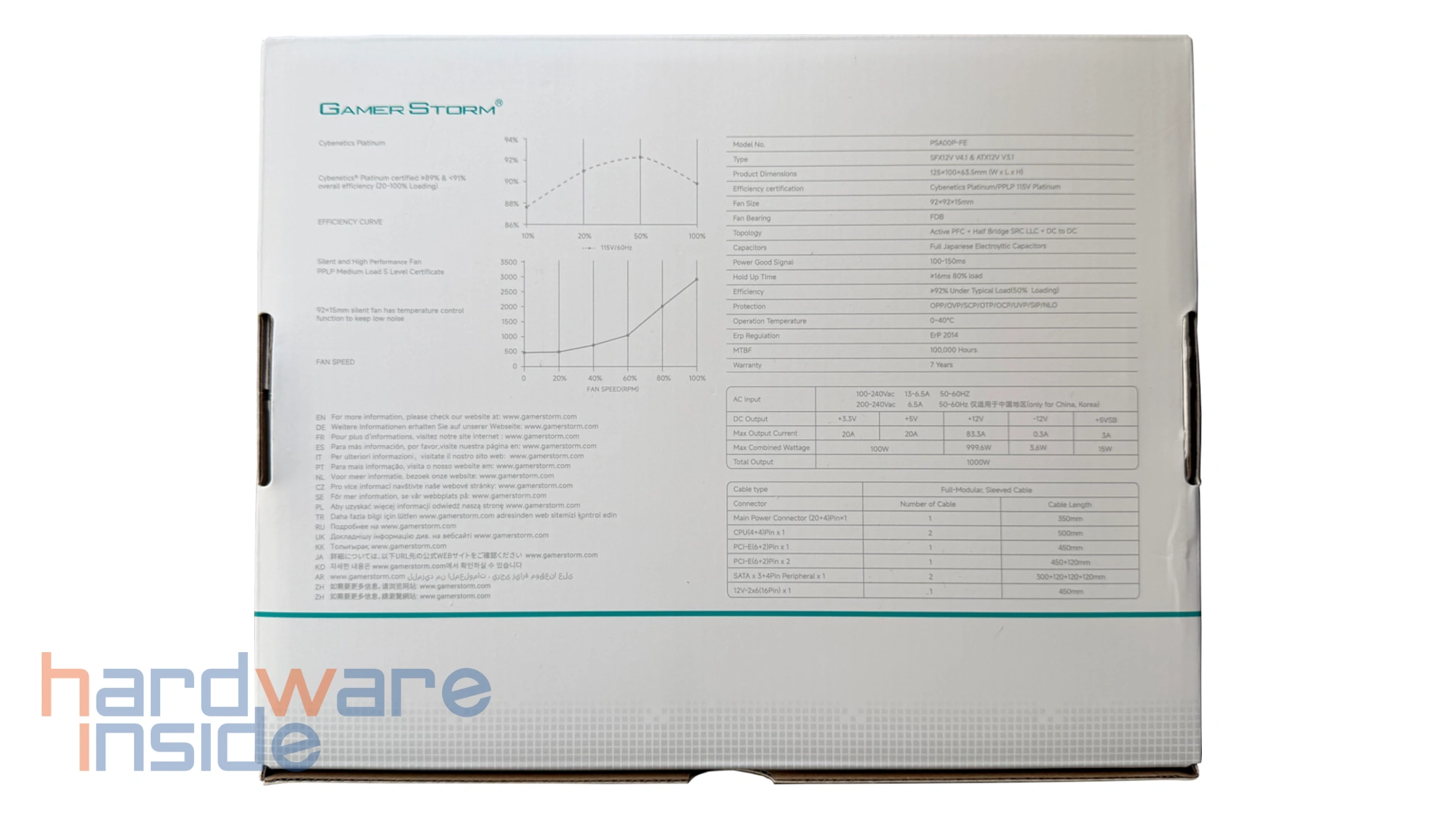 Die Verpackung des GAMER STORM PS-P präsentiert sich modern, hochwertig und funktional. Auf der Vorderseite werden direkt die wichtigsten Features hervorgehoben, darunter der ATX 3.1 Support, die Cybenetics Platinum Zertifizierung sowie der native 12V-2×6 Anschluss für aktuelle High-End-Grafikkarten.