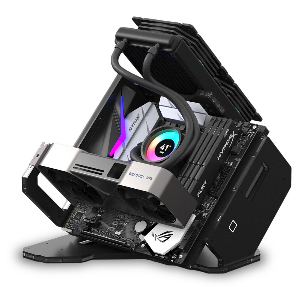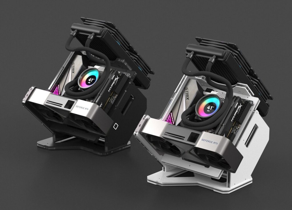 Beide Modelle sind in Schwarz oder Weiß erhältlich, verfügen über keine Front-I/O-Anschlüsse und basieren auf derselben konstruktiven Methodik. Durch das geneigte Design wird das Netzteil unterhalb des Mainboards platziert, was eine besonders durchdachte Anordnung der Komponenten im offenen Gehäuseumfeld ermöglicht.