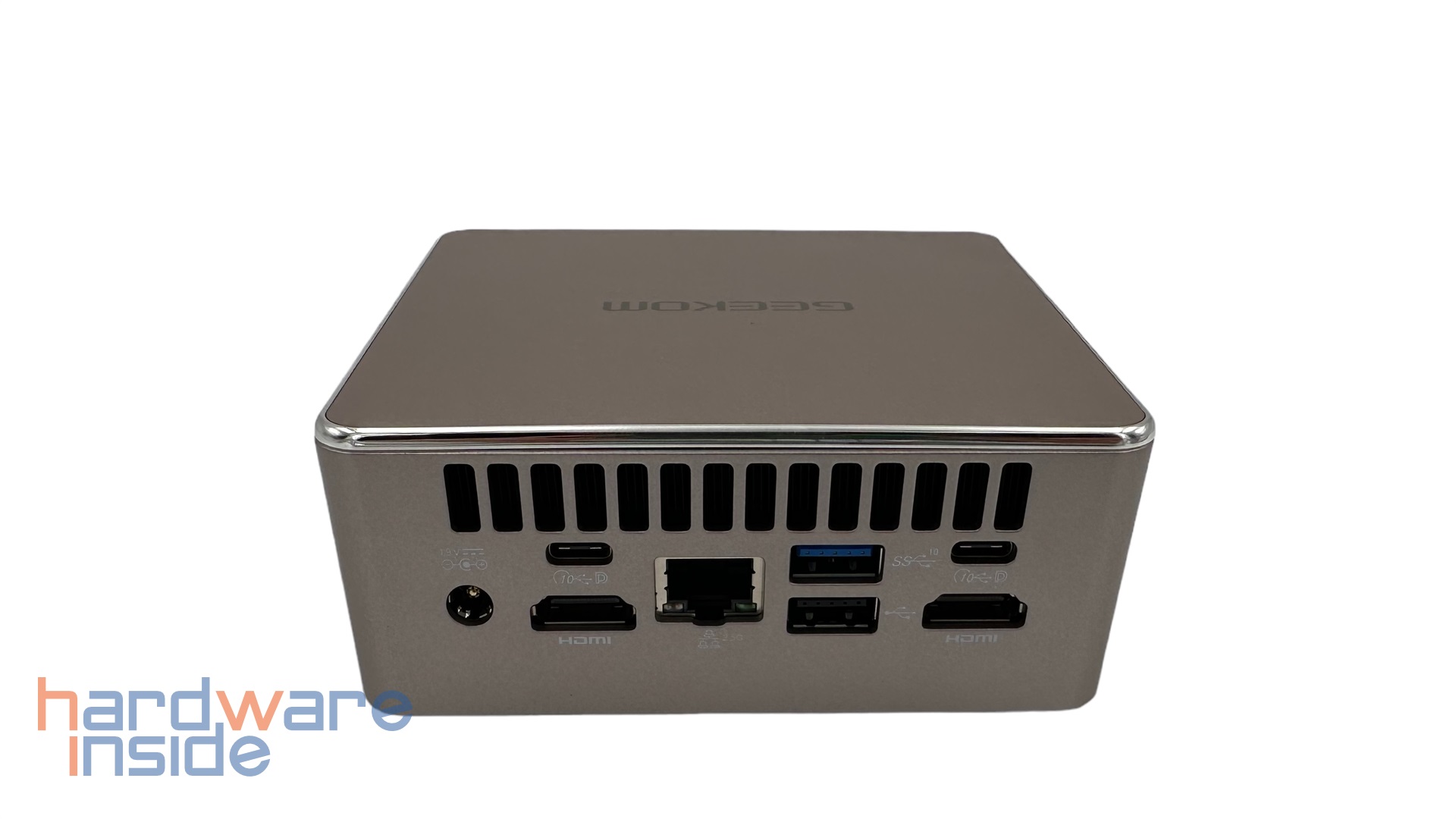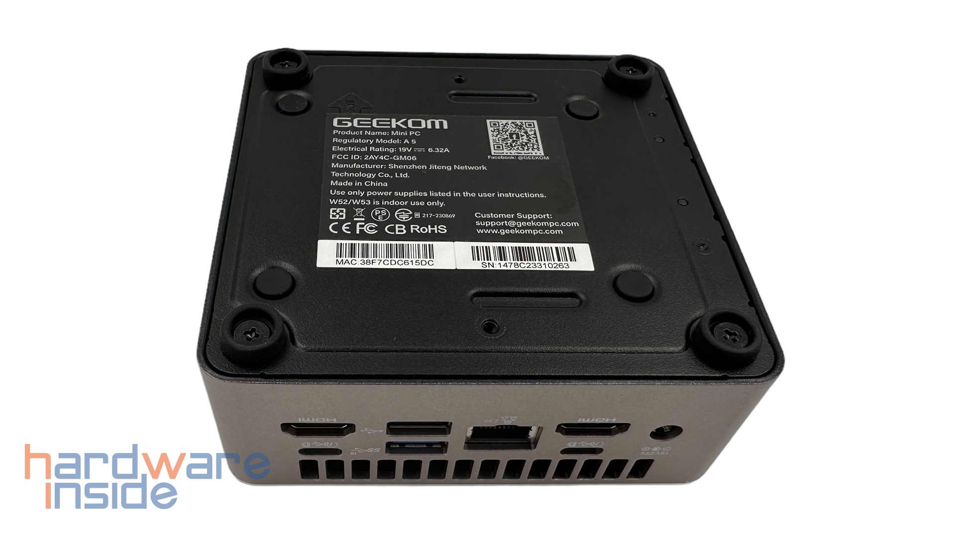 An der Rückseite des GEEKOM A5 Mini PC finden wir im oberen Bereich weitere Lüftungsöffnungen, wobei diese im Design anders als jene an den Seiten gestaltet sind. Sie sind hier deutlich größer. Weiter finden wir hier vier USB-Anschlüsse, davon sind zwei Typ-A- und zwei Typ-C-Anschlüsse. Dazu kommen noch zwei HDMI-, sowie ein RJ45- und der Netzteil-Anschluss.